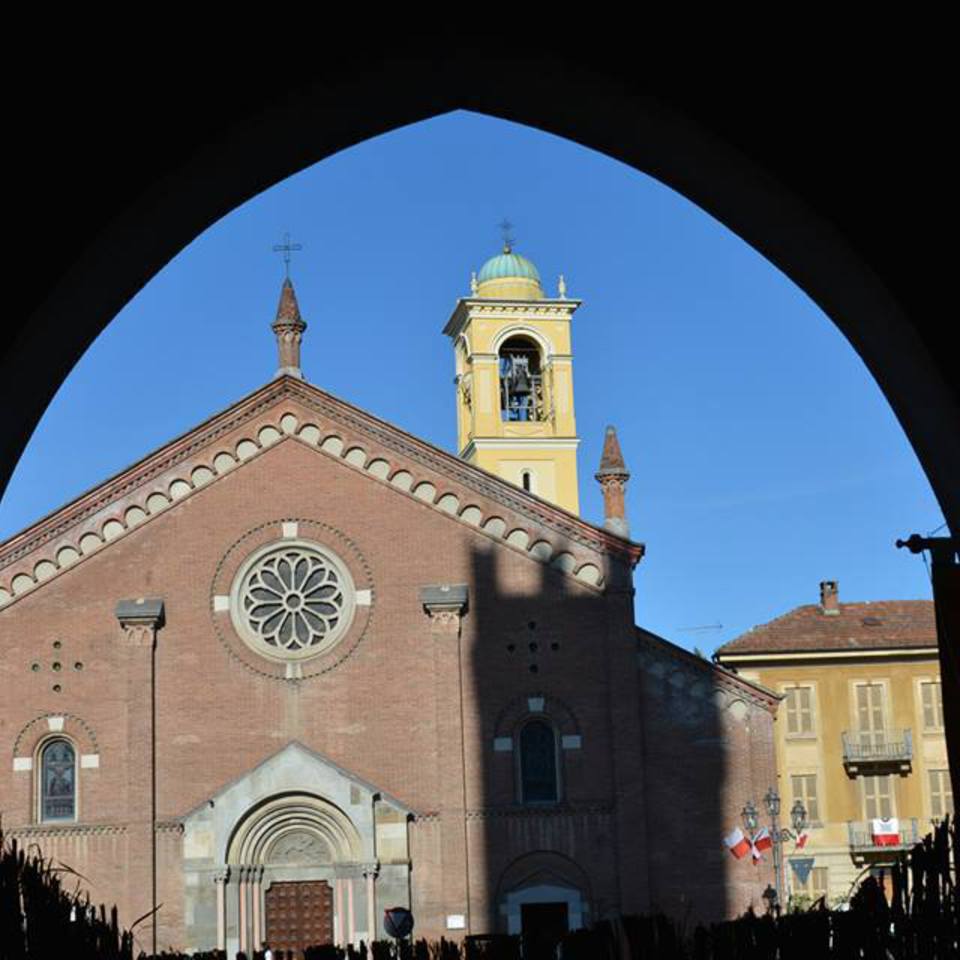 Originariamente era a croce latina e aveva la facciata rivolta verso via D’Azeglio; al tempo di Federico Barbarossa il vecchio edificio fu ampliato, la pianta fu modificata e la facciata rivolta verso la piazza. La chiesa assunse l’attuale aspetto nel 1588, con ogni probabilità su progetto di Pellegrino Tibaldi; nel 1621 il Papa le concesse il titolo di “insigne collegiata”.