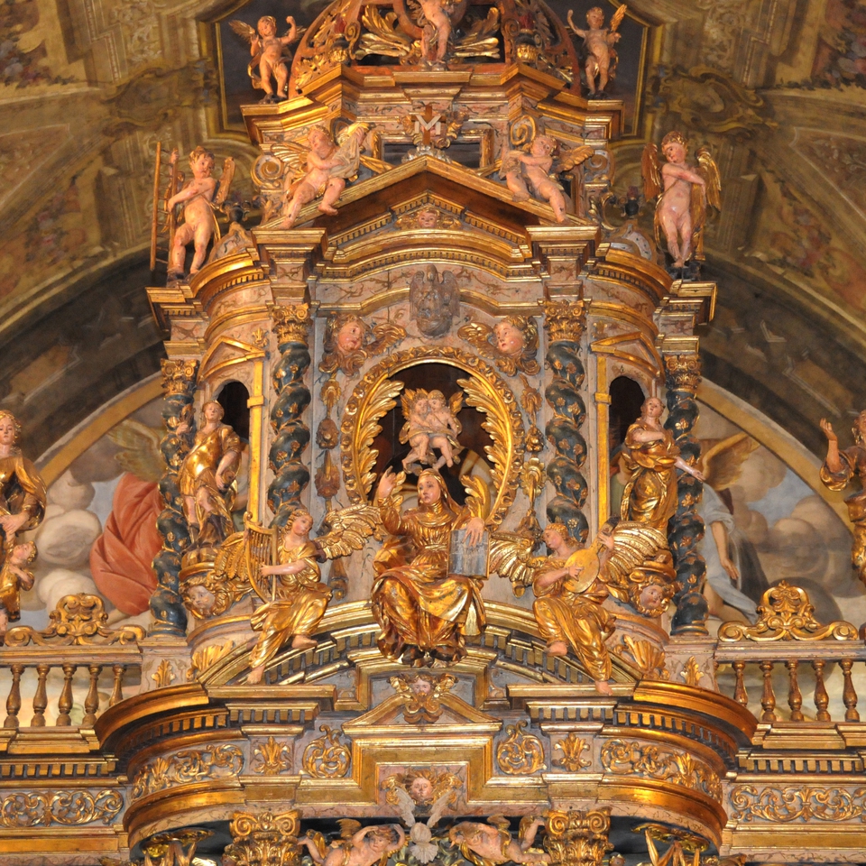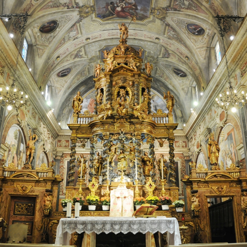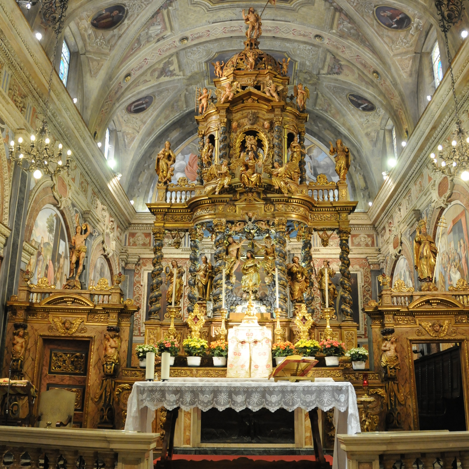 Di grande pregio è l'edicola lignea ricchissima e gremita che orna l'altare maggiore realizzata da Giovanni Antonio Vaglio di Pettinengo fra il 1682 e il 1684, uno dei migliori intagliatori biellesi del XVII secolo: al centro la Trinità incorona la Vergine e sui lati, fra le snelle ed eleganti colonnine tortili, le quattro virtù cardinali e sopra le tre virtù teologali.