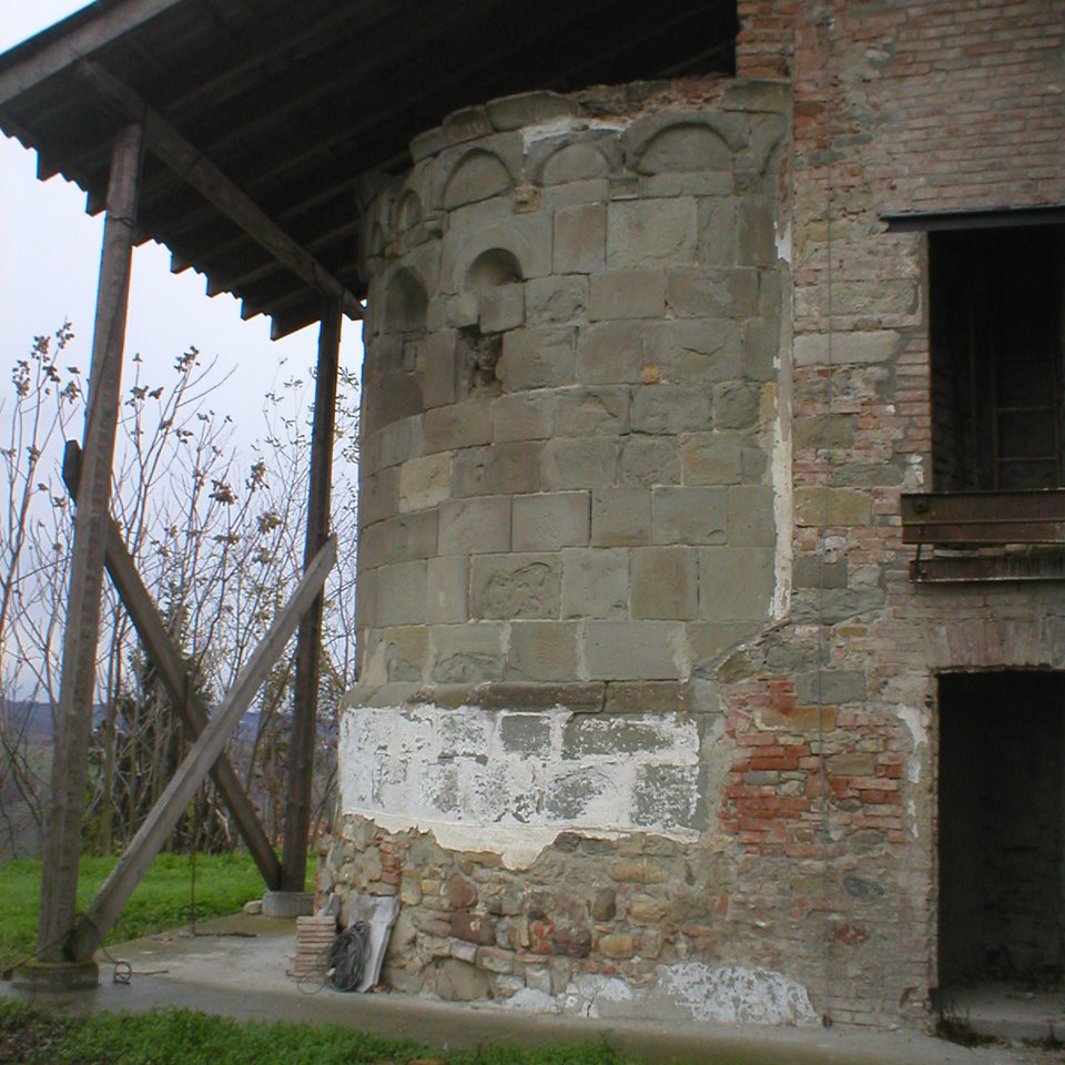 Sotto gli archetti pensili della parte alta sono ancora visibili due eleganti monofore, una delle quali in parte sigillata da pietre e materiale da riempimento.