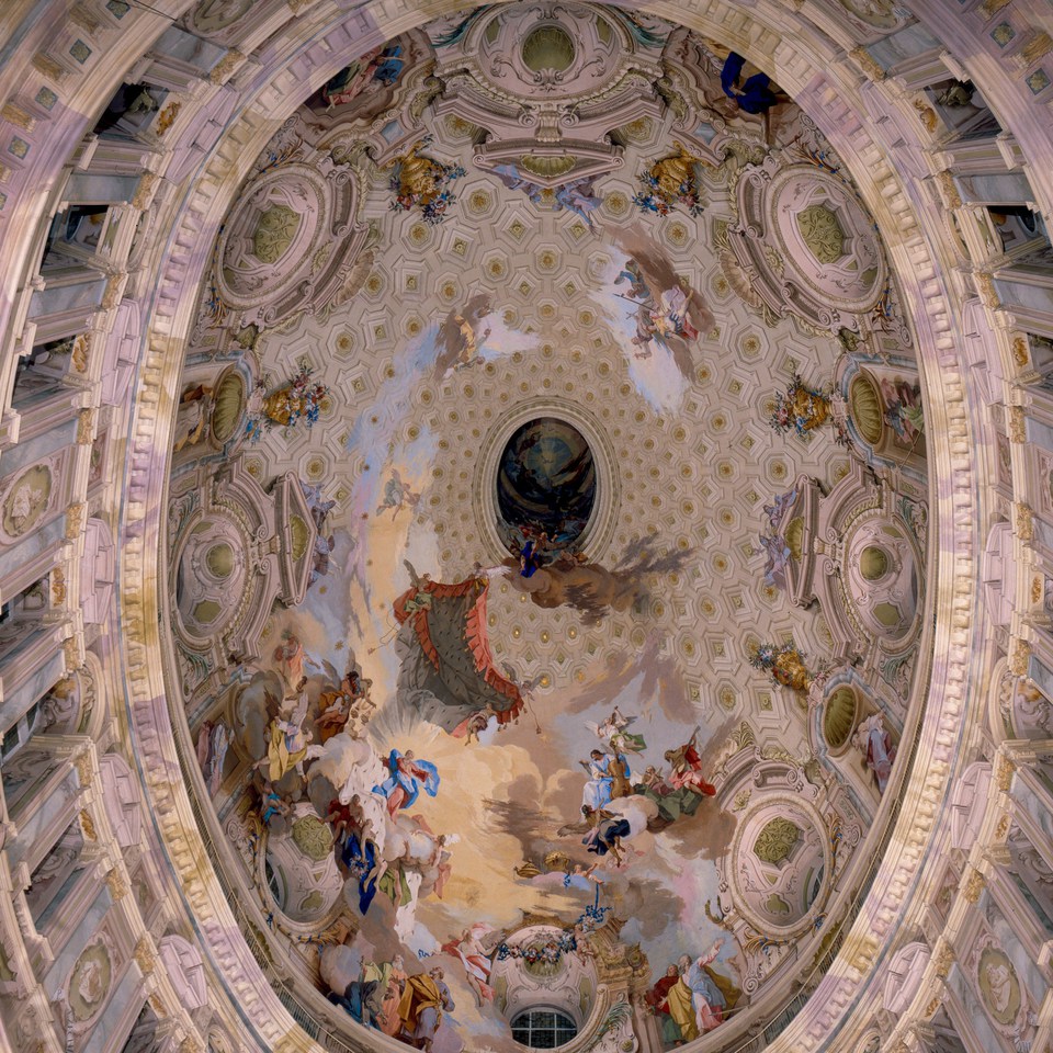 Furono Mattia Bortoloni di Rovigo, figurista di scuola veneta e Felice Biella (chiamato Felicino) di Milano, quadraturista, a sviluppare su oltre seimila metri quadrati l'affresco più vasto del mondo a tema unico: la sto¬ria della salvezza attraverso Maria e la gloriosa assunzione della Madonna nell'Empireo. Ne risultò una magistrale pagina di pittura sorretta da una sapiente regia, suggerita forse dai monaci.