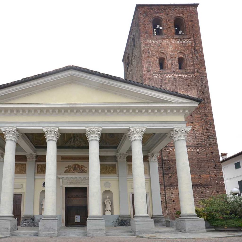 Le fonti attestano che nel 1181 la chiesa di Santhià per "antica fama e continua tradizione" era stat dotata e arricchita di numerose prebende e donazioni dall'Imperatore Carlo il Grosso. In quegli anni doveva dunque esistere una chiesa o una pieve con tanto di campanile, infatti sotto l'attuale presbiterio sono ancora conservate tracce di questo primo impianto romanico denominato Scurolo di Santo Stefano e databile intorno al 1125-1150. Questo impianto andò perduto nel XVI secolo anni in cui infuriarono per tutto il territorio della diocesi aspri scontri tra le artiglierie imperiali, i capitani di ventura e i signori locali. Dunque la chiesa, ricostruita a partire dalla seconda metà del Cinquecento, subirà poi una seconda ricostruzione in stile neoclassico nel 1836 ad opera del progettista Giuseppe Talucchi. La chiesa ora appare ancora con la facciata neoclassica preceduta da un ampio pronao esastilo che fa da contrappunto al massiccio campanile che seppur ricostruito mantiene quasi intatte le sue forme romaniche. L'interno è suddiviso in tre navate separate da eleganti pilastri in marmo bianco che sorreggono le imponenti volte a botte del presbiterio e delle navate laterali. l'apparato decorativo di notevole pregio e buona stato di conservazione è ad opera dei decoratori: Paolo Emilio Morgari, Luigi Hartman e Carlo Costa. Opera di squisito pregio è infine il polittico a dieci tavole dipinto da Gerolamo Giovenone raffigurante la Madonna con Bambino, Sant'Agata e Santi cari alla devozione locale.