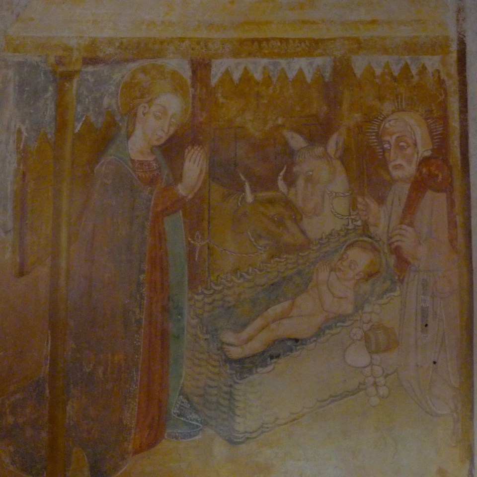 Le pareti dell’abside sono state affrescate da Giovanni Mazzucco nel 1481, mentre è indecifrabile il nome del committente. Si ammira una Madonna che allatta il Bambino, Sant’ Antonio Abate e San Rocco protettori contro la peste, San Giuliano, Santa Lucia, San Michele Arcangelo, San Giorgio, un’ Annunciazione ed una Natività con Gesù deposto in una cesta di vimini tra Maria e Giuseppe, Di lato, come doni, sono raffigurati formaggio, aglio ed una fiaschetta di vino.