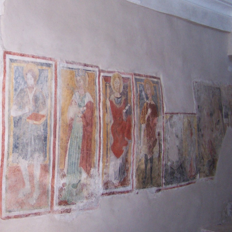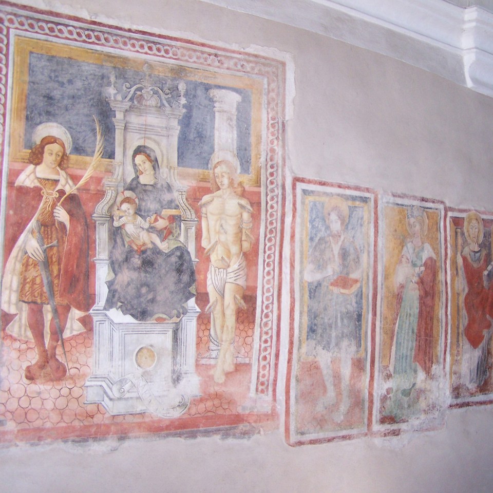 Sulla parete sinistra (vicino alla porta di ingresso) un affresco cinquecentesco con la Madonna in trono col Bambino tra San Sebastiano e un santo martire che regge una spada, forse San Nazario, all’interno di una cornice a cerchi concatenati, grigi su fondo ocra rossa. Proseguendo verso l’abside si trovano quattro riquadri con cornici bicrome con San Giovanni Battista con la tunica in peli di cammello; Santa Caterina d’Alessandria con la ruota del martirio; San Giacomo Maggiore con il bordone; e San Martino di Tours con il mantello tagliato. Nei tre riquadri seguenti, piuttosto compromessi, una Madonna col Bambino tra Santa Margherita d’Antiochia che calpesta un drago, e un giovane che regge un libro; segue una Crocifissione tra due Santi.