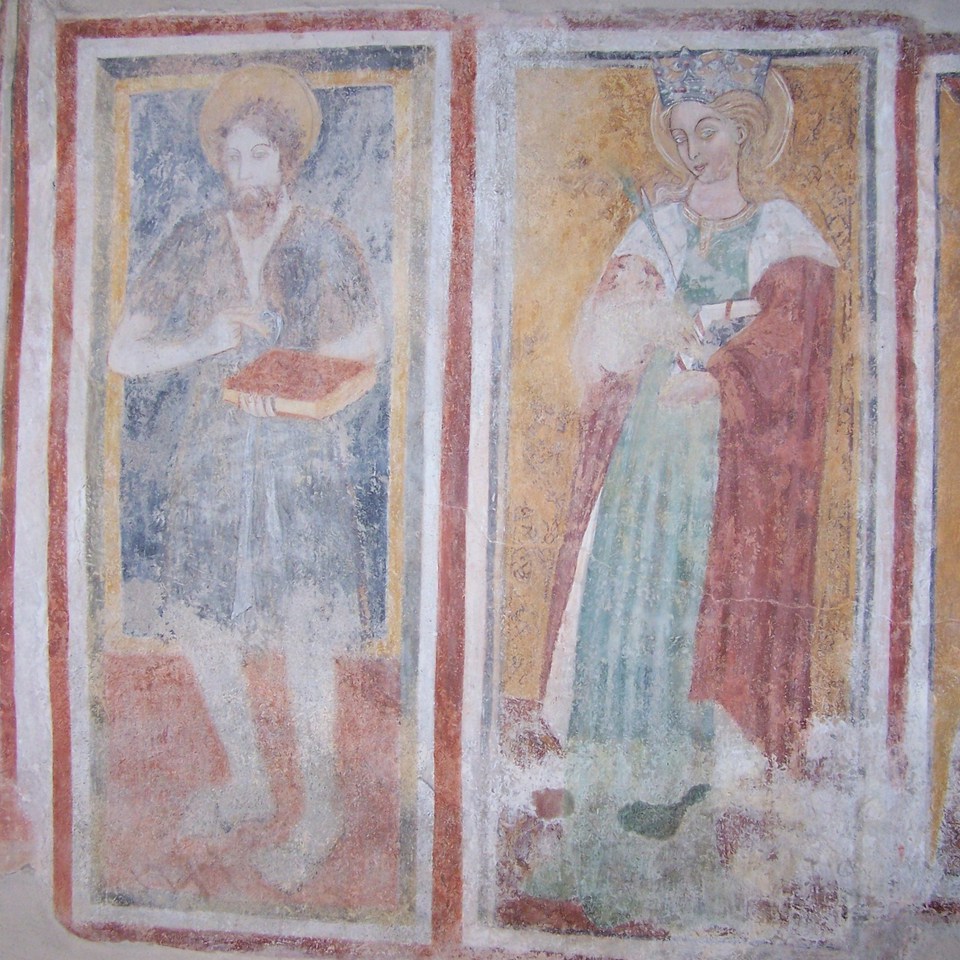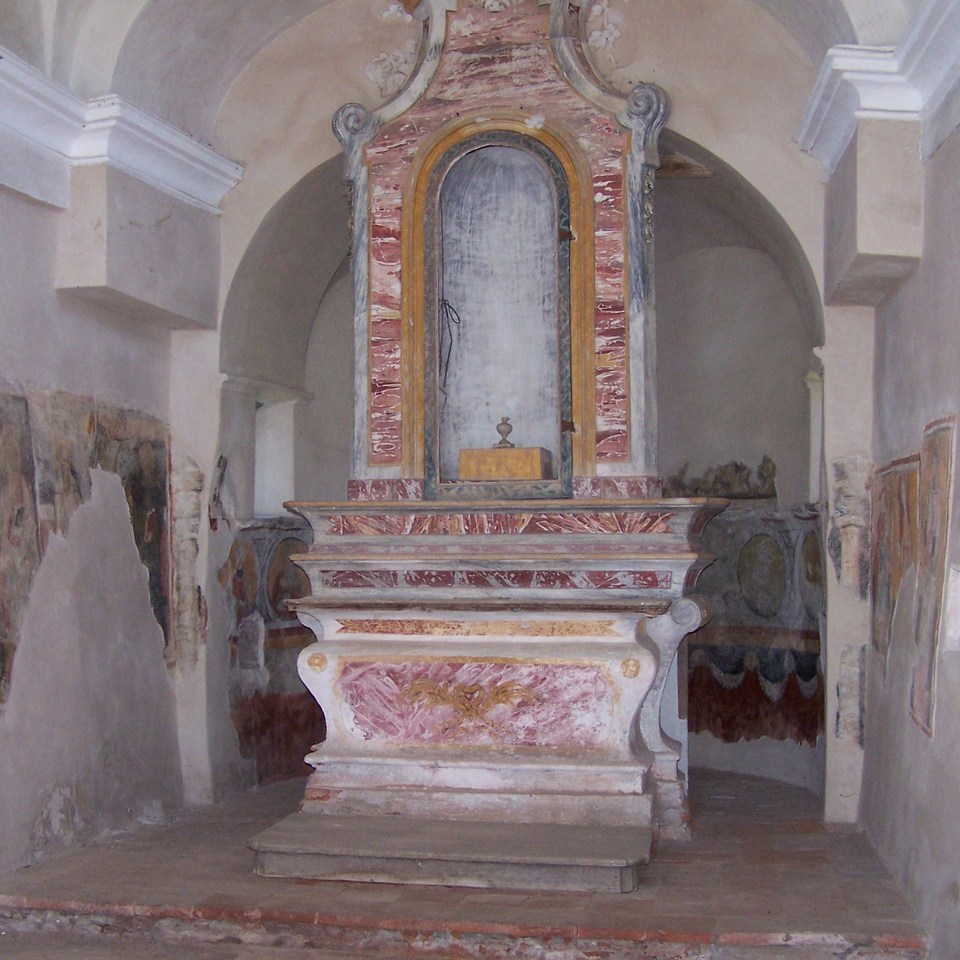 Nell’abside tracce di una originaria decorazione in due fasce sovrapposte: una inferiore con un finto velario, e una superiore con sei tondi con busti di Santi.