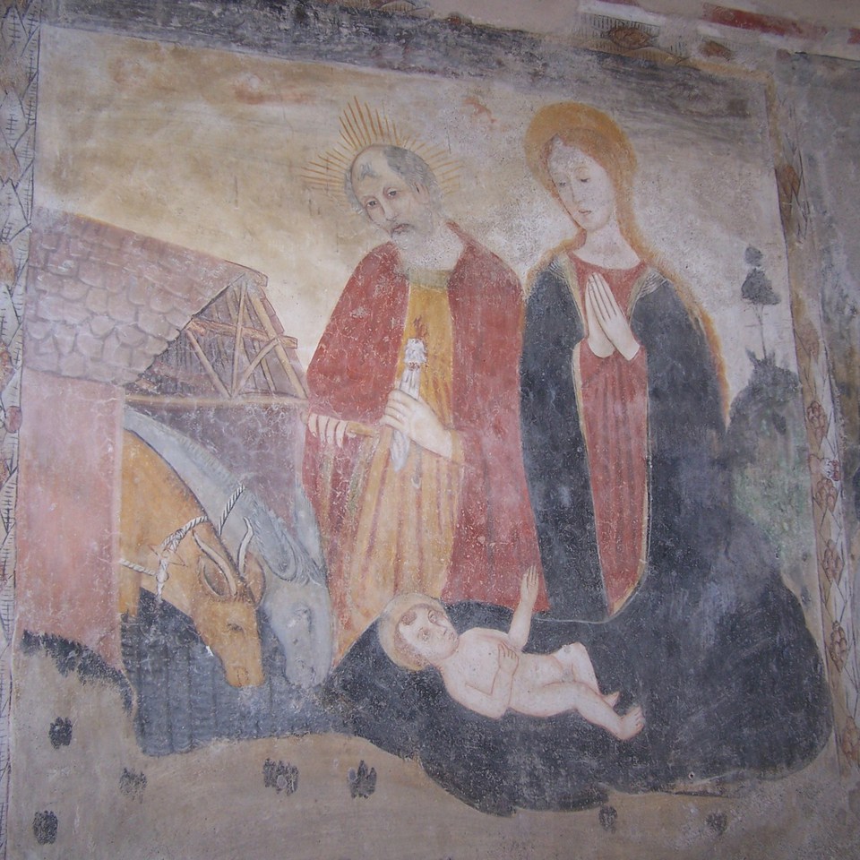 Sulla parete destra, partendo dalla zona absidale, si trovano tre riquadri contigui entro cornici bicrome con San Nazario in abiti cortesi, che regge un libro; Santa Lucia che sostiene il vassoio con i bulbi oculari; e San Bartolomeo con il coltello strumento del suo martirio. A seguire sono affrescate, entro cornici con motivi fitomorfi, due scene contigue, la Natività con Gesù a terra sul manto di Maria e l’ Adorazione dei Magi, con la Madonna seduta su una sella di cavallo.