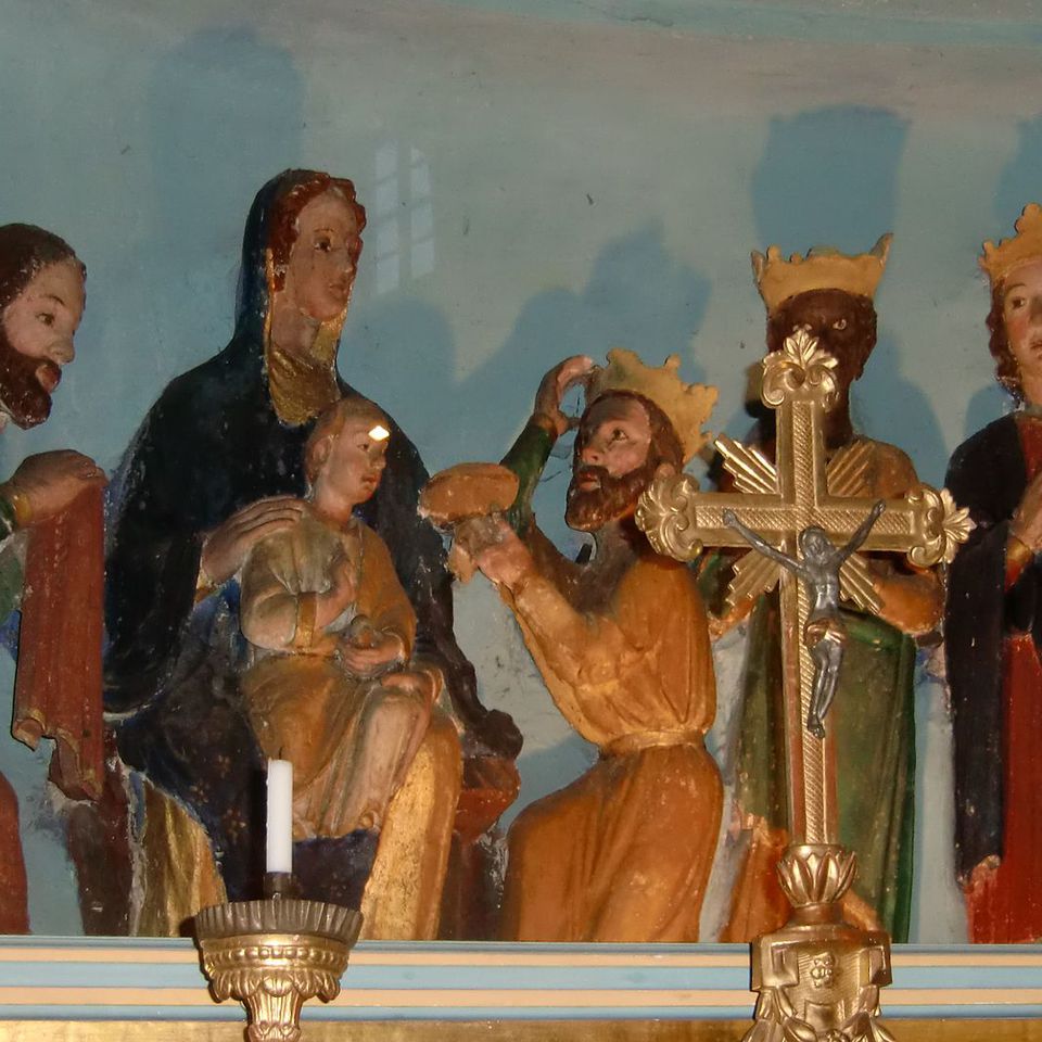 Di notevole interesse storico ed artistico è il gruppo in terracotta posto sopra l'altare maggiore: si tratta di una Adorazione dei Magi, databile al 1230 - 1240. Composto da sei figure in alto rilievo (che si presentano quasi a tutto tondo), il gruppo - per quanto abbia subito numerose maldestre dipinture - costituisce un'opera di notevole qualità attribuita ad un artista di scuola franco-piemontese.