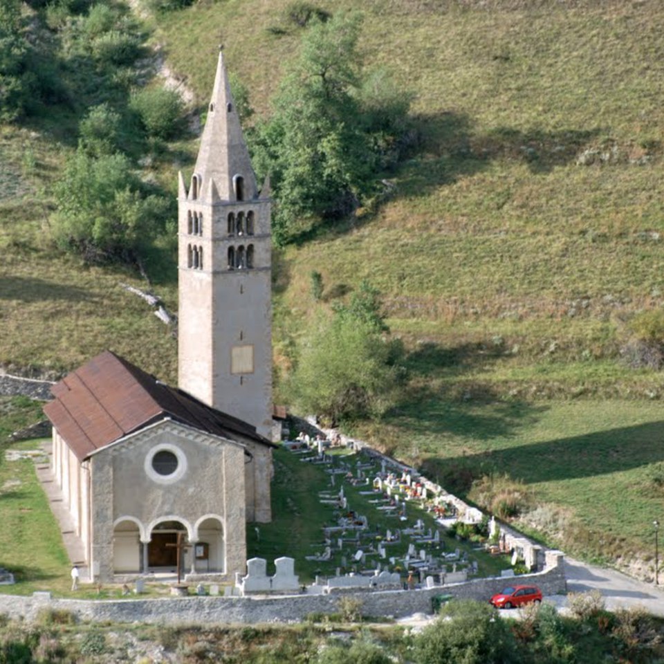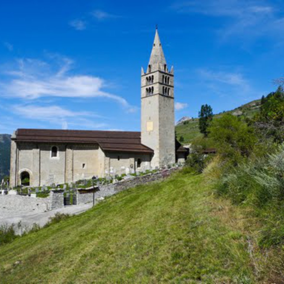 Un tempo la chiesa aveva la funzione di chiesa-fortezza: circondata da un muro difensivo e dalle mura massicce, serviva infatti da riparo alla popolazione in caso di scorribande e guerre. La facciata a capanna ospita un portico di tre campate, con archi a sesto ribassato, ed è coperto da volte a crociera intonacate e tinteggiate con tre piccole chiavi lavorate a fiore. Gli archi degli ingressi laterali del portico hanno il concio della chiave di volta decorato con il Giglio di Francia che ricorda l’appartenenza al territorio francese fin dal 1344. Il portale d'ingresso è incorniciato da un arco a tutto sesto, con lunetta e piattabanda sottostante, che si imposta su due semicolonne di pietra con capitelli scolpiti. La chiesa ha un'unica navata articolata in quattro campate, coperte da volte a crociera, intonacate e tinteggiate. L’area absidale è coperta da una volta a crociera ogivale, intonacata e dipinta, con costoloni in finta pietra e tondo decorativo centrale. Sulla fiancata destra della chiesa si trova la torre campanaria, simile ad altri campanili presenti nel Delfinato, si caratterizza, nella parte inferiore, per una struttura massiccia, segnata da piccolissime feritoie, alleggerita in sommità da due livelli di grandi trifore su colonnine binate e capitelli a stampella. La cuspide a base ottagonale e gli acroteri, posti sugli angoli, sono in conci di pietra di disegno nitido; una sfera con croce metallica conclude la struttura. Alla base del campanile sono stati ricavati alcuni spazi che ospitano la sacrestia, una cappella e l’antico coro. L’interno della chiesa non conserva molte decorazioni pittoriche. Tutte le membrature portanti sono state decorate a finta pietra, mentre le altre superfici sono tinteggiate di azzurro con fasce decorative geometriche poste lungo le direttrici delle volte a crociera. L’abside è decorata da un affresco che simula un’architettura: quattro colonne con capitelli corinzi reggono un finto frontone di marmo a volute su cui è affrescata una piccola edicola con le rappresentazioni dei Santi Restituto, Giusto e Claudio. Sopra l’arco a sesto acuto si trova una pittura murale realizzata da Pietro Vamala nel 1847 e che rappresenta Cristo con la croce circondato da due Santi. L’abside ospita inoltre un dipinto realizzato intorno alla metà del XVII secolo dal pittore-canonico Jacques Roux e che raffigura San Restituto e Santo Stefano che adorano l'Eucaristia.