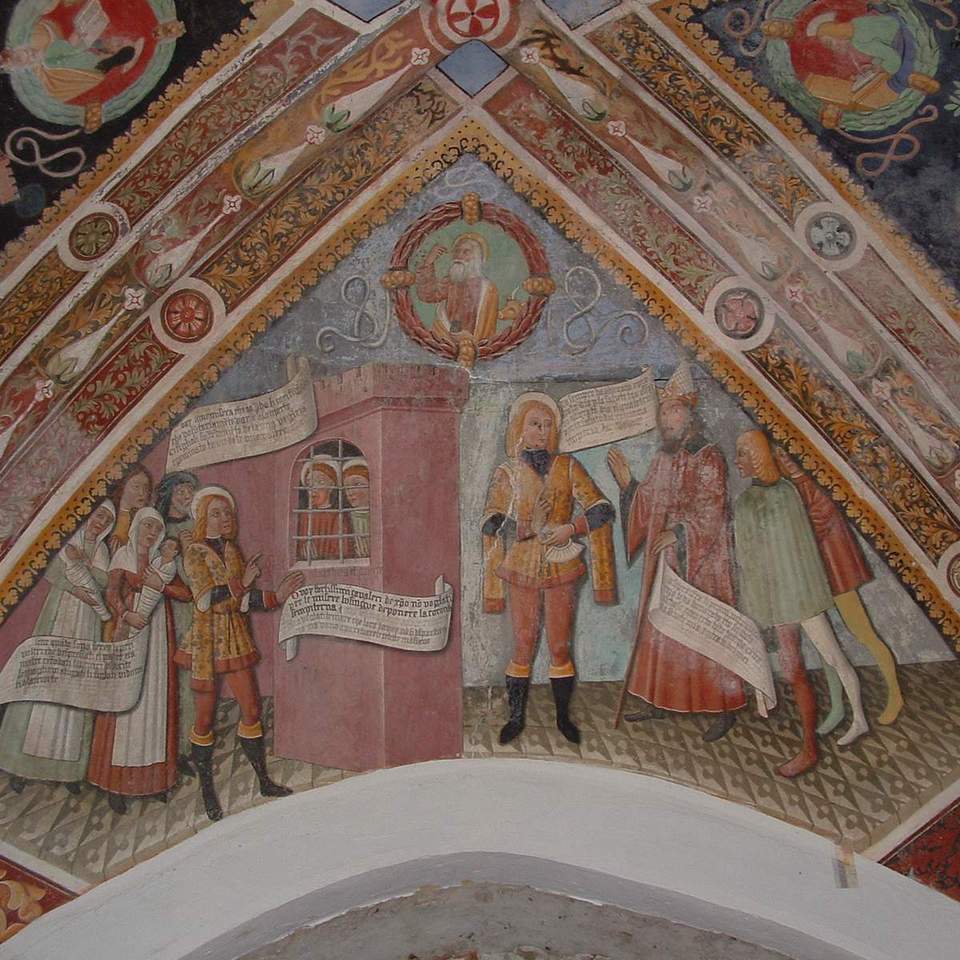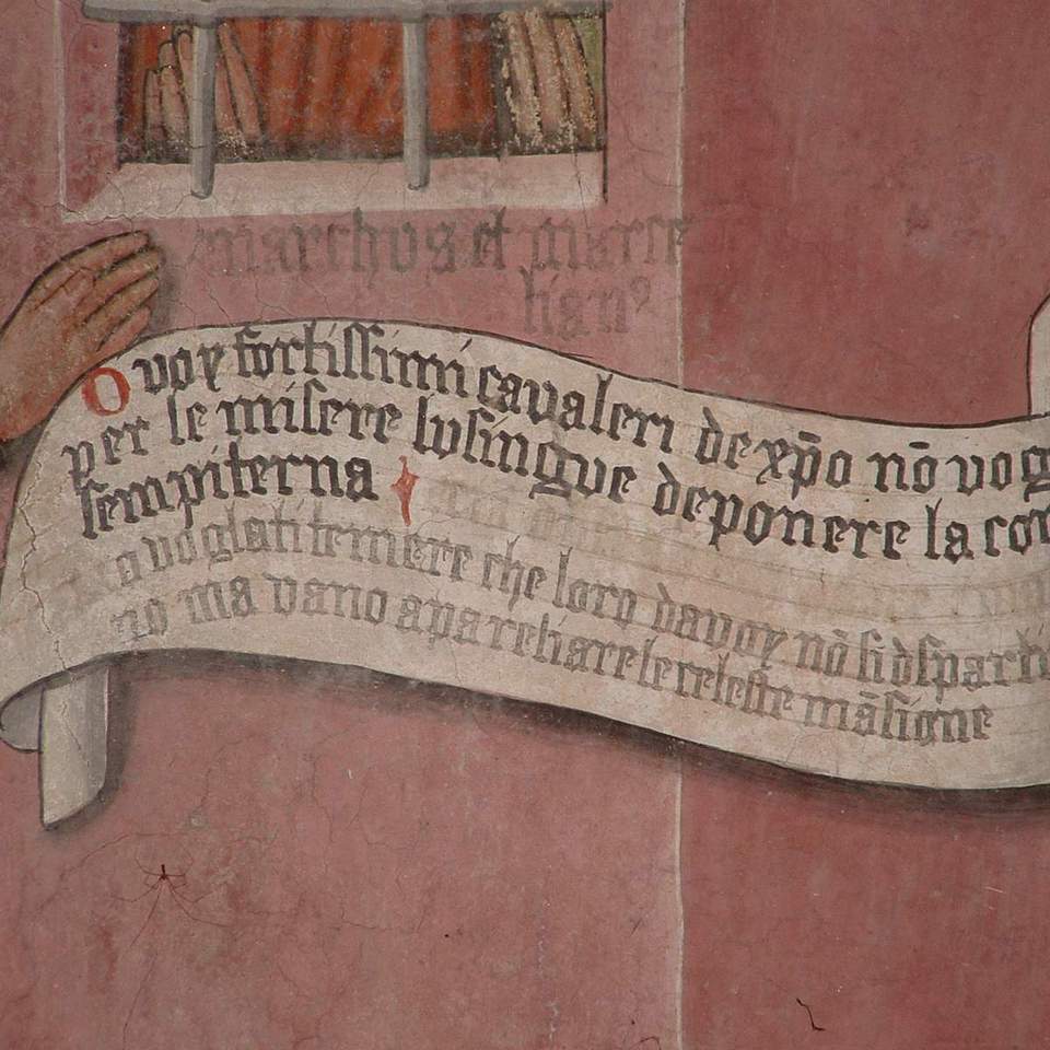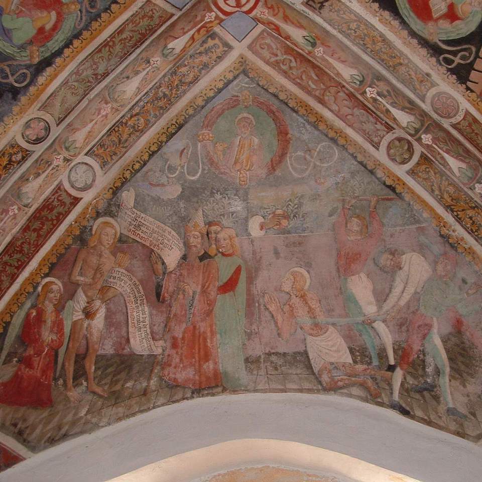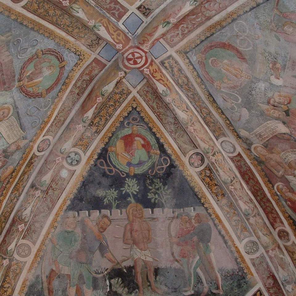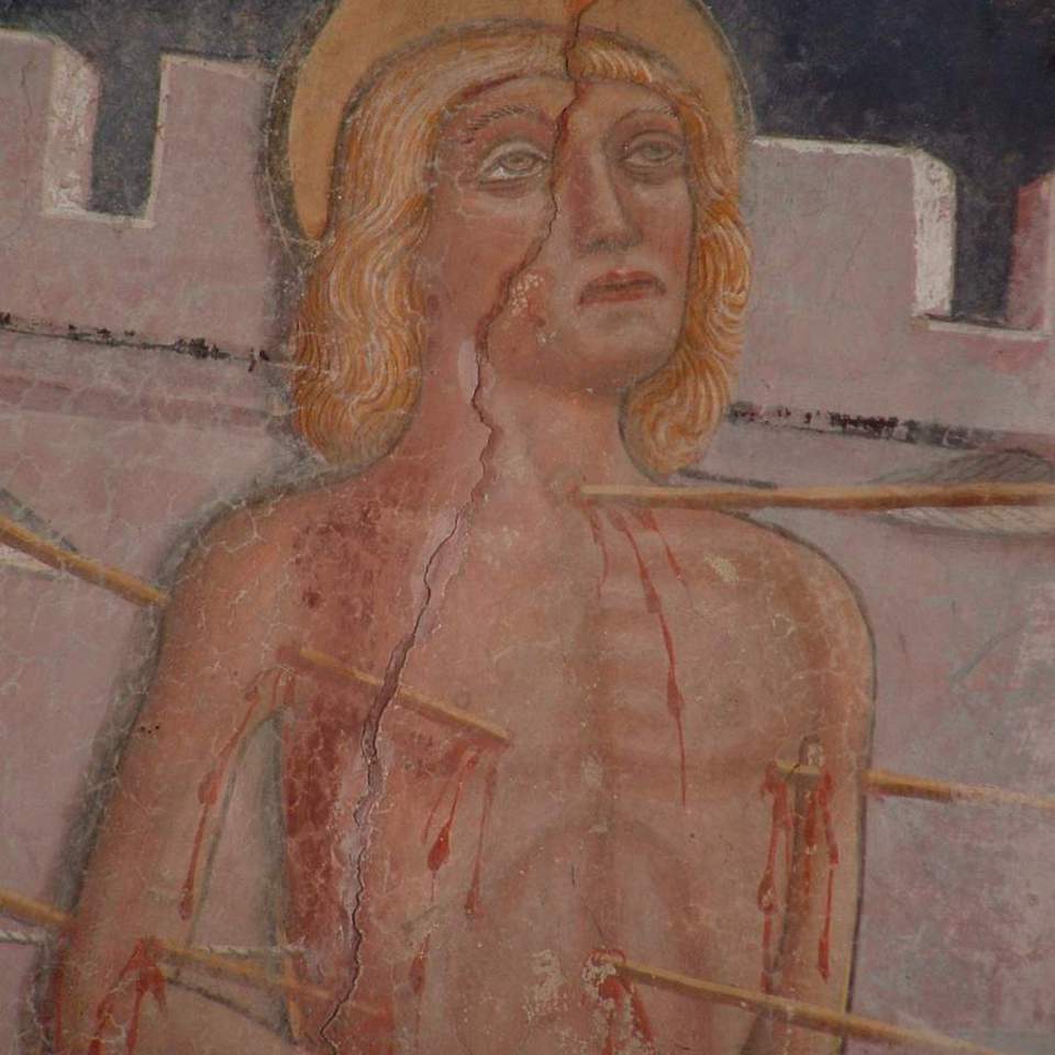 I raffinati affreschi di San Sebastiano, attestanti, in particolare nel repertorio degli ornati, l'apertura dei Biasacci verso temi di cultura umanistica, narrano toccanti aspetti devozionali della società buschese del Quattrocento: " [...] le collusioni con le recite dei drammi sacri sono apertamente dichiarate dai dialoghi e dai monologhi dei personaggi sui filatteri recanti le battute in volgare e in più da certe architetture precarie dall'aspetto inequivocabile di scenografie, come l'ingegnoso edificio dentro il quale San Sebastiano viene gettato, per ricomparire, curato da Sant'Irene, nel cunicolo della Cloaca Maxima sottostante" (M. Bartoletti, 2008, p. 178). Il ricorrente dramma della peste vide la popolazione votarsi al Santo per la cui intercessione avrebbe avuto fine, nel 680, il terribile contagio di Roma, come evidenziava Francesco Fino nei suoi studi editi nel 1992.