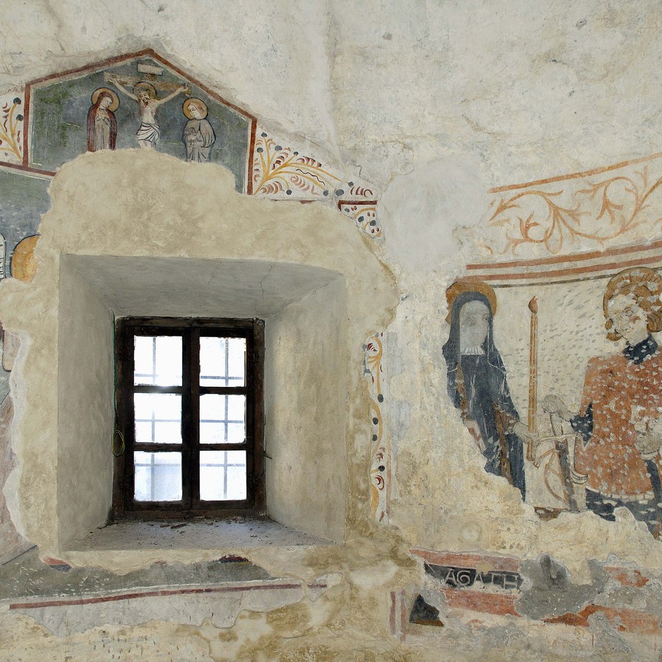 All’interno, la struttura si presenta a tre navate, con archi a tutto sesto, cappelle laterali e abside semicircolare. I restauri condotti nel 2005 hanno portato alla luce, nell’absidiola destra, successivamente trasformata in sacrestia, alcune scene affrescate disposte a pala d’altare, attorno alla monofora. Esse sono state assegnate ad un anonimo pittore operante nella seconda metà del Trecento e influenzato dai modi del gotico d’Oltralpe. La scena principale è costituita dall’Annunciazione, di cui resta parte dell’angelo a sinistra della finestra. Nella cuspide si trova raffigurata la Crocifissione con, ai lati, la Vergine e San Giovanni mentre, sulla destra, sono visibili le raffigurazioni frammentarie di Sant’Agata e San Sebastiano. Al medesimo autore sono assegnabili anche i frammenti di affreschi rinvenuti all’esterno dell’edificio, a ridosso della prima absidiola sulla fiancata sud, rappresentanti la Crocifissione, le Tentazioni di Sant’Antonio e San Michele Arcangelo. Al di sotto di questi, il Supplizio di San Sebastiano ha elementi in comune con i Profeti scoperti sul fianco destro del duomo di Susa ricondotti al Maestro di San Bernardino a Lusernetta. Tra gli arredi interni sono da menzionare la pala d’altare raffigurante la Vergine Addolorata con Sant’Antonino Martire, commissionata a Sebastiano Taricco alla fine del XVII secolo, la tela con Gesù Crocifisso e la statua della Madonna del Rosario realizzati a cavallo tra Sei e Settecento.