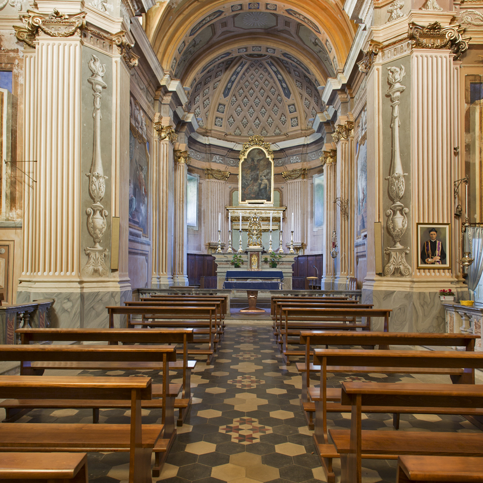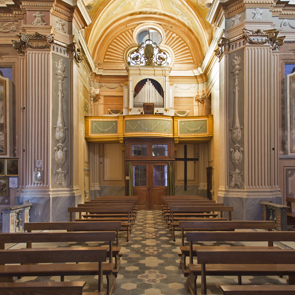 Internamente l'edificio a croce greca è caratterizzato dalla presenza di due cappelle laterali. La cappella laterale di destra è intitolata alla Madonna delle Grazie, mentre quella di sinistra a Sant'Antonio Abate. L'altare della cappella dedicata alla Madonna delle Grazie è decorato in stucco marmorizzato ed è caratterizzato dall'affresco della Madonna con Bambino ad opera del Maestro d'Elva, Hans Clemer. La cappella dedicata a Sant'Antonio Abate ha un altare in stucco dipinto a finto marmo e due statue in stucco raffiguranti la Fede con la croce in mano e la Speranza con l'ancora. La pala d'altare raffigurante il Santo è riconducibile alla fine del XIX - inizio XX secolo.