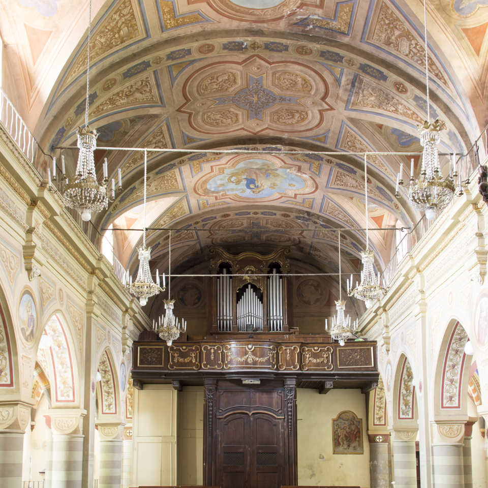 Il pulpito, databile verso l'inizio del Seicento, è in legno intagliato, e proviene dalla chiesa di S. Francesco in Pinerolo, demolita nel 1802 per iniziativa del governo francese.
