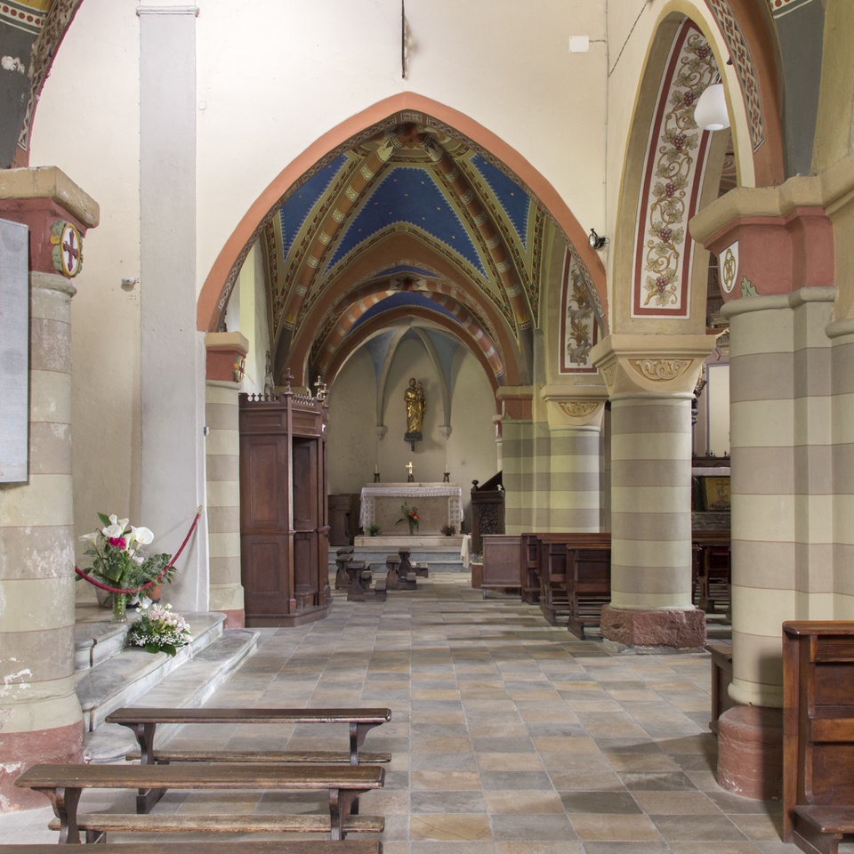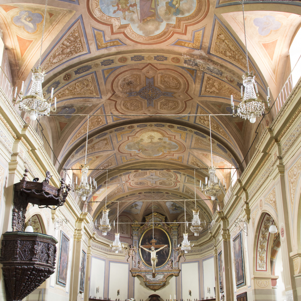 L'attuale altar maggiore è installato dopo il Concilio vaticano II, mentre il crocifisso pendente esisteva già nel 1648.