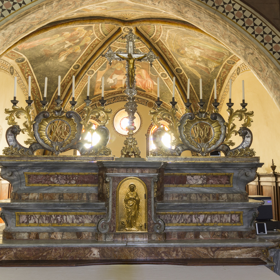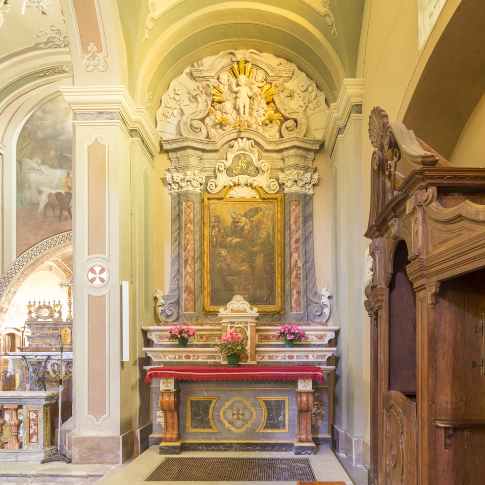 Sul pilastro dell’arco di trionfo che funge da raccordo tra l’abside e il resto della chiesa sono rappresentati uno stemma dei Savoia e un altro del casato Romagnano.