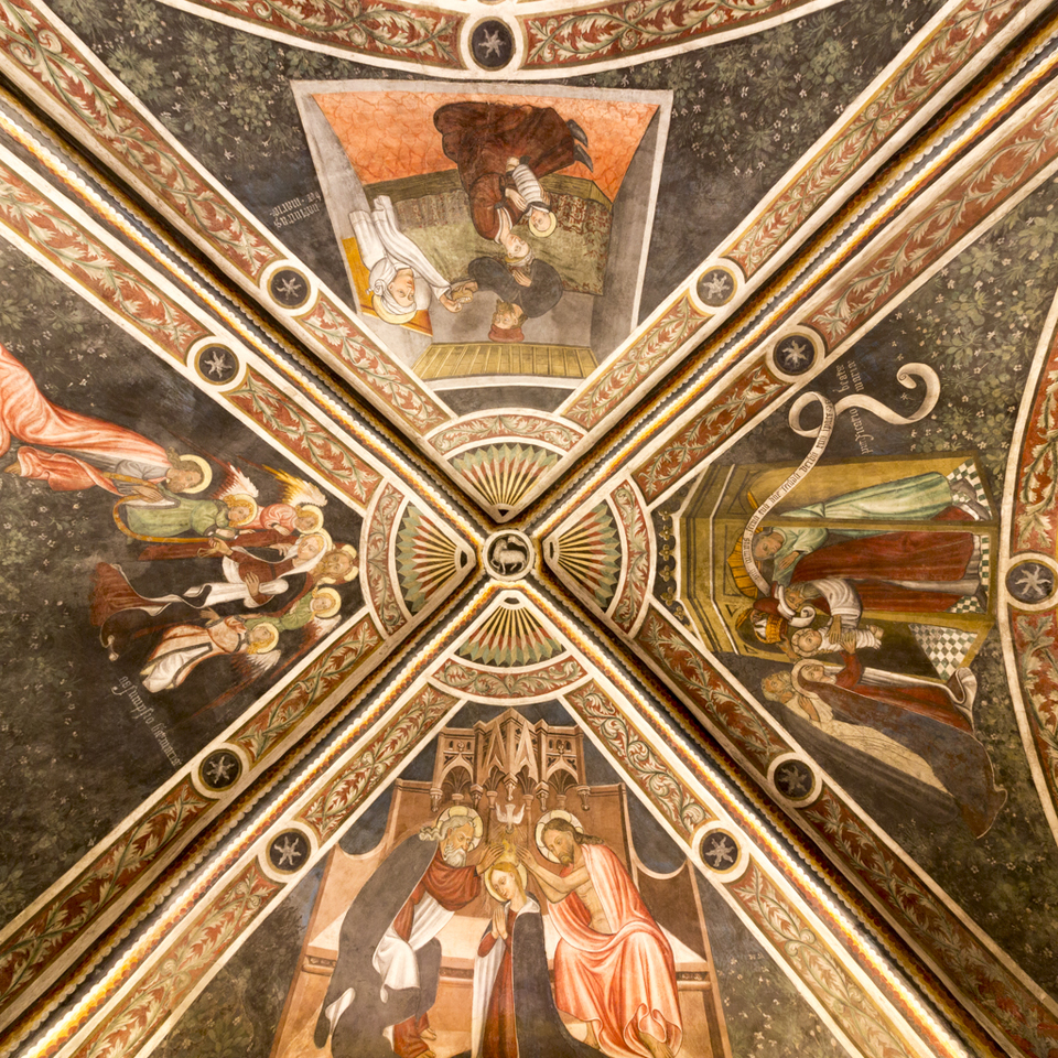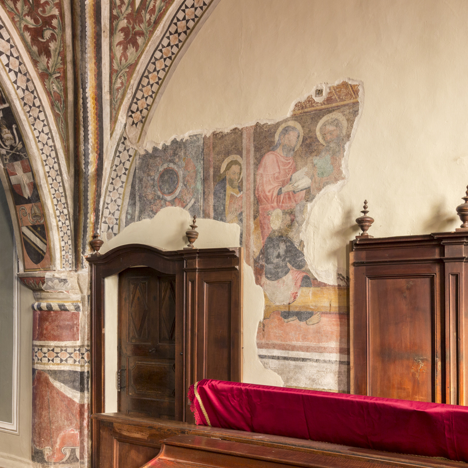 Nella predetta visita non si fa citazione degli affreschi esistenti nella zona absidale, che pure al presente sono attribuiti a Giovanni Franzini, o diversamente ad altro artista di ispirazione jaqueriana della prima metà del XV secolo. La teoria pittorica è andata quasi perduta sulle pareri, al contrario è ben conservata sulla volta, e ciò permette di apprezzarne la qualità e i particolari che qui analiticamente descriviamo.