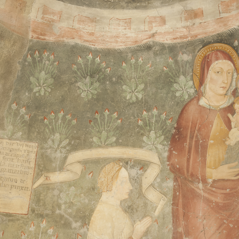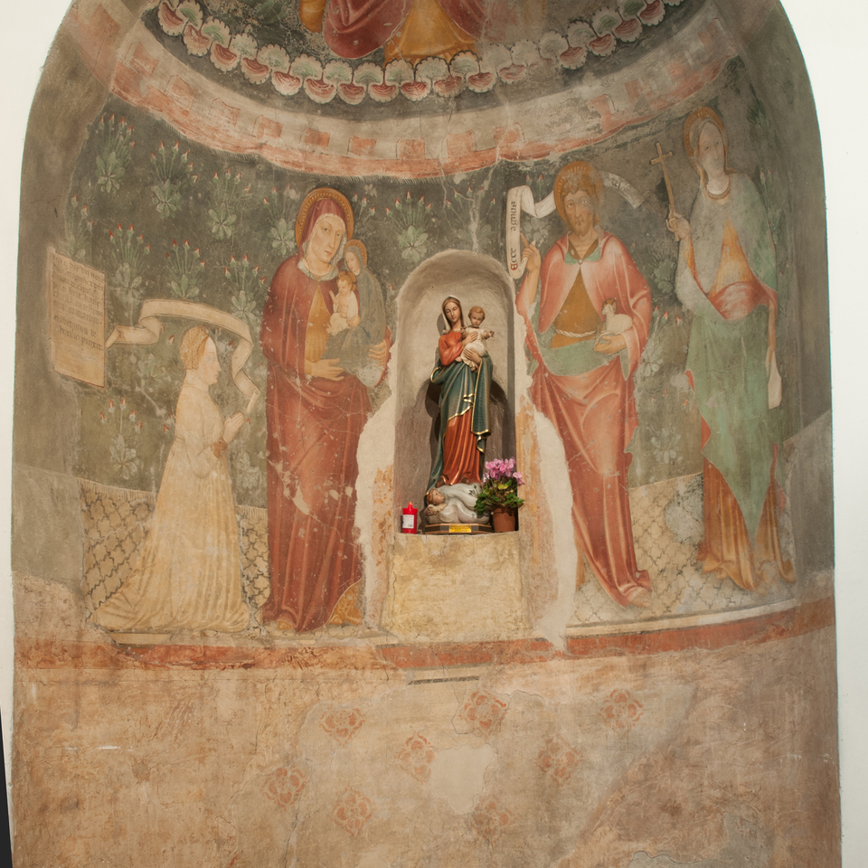 Nell’abside sinistra all’interno della chiesa si trova un bellissimo affresco quattrocentesco firmato da Manfredino Boxilio, pittore di scuola lombarda. Raffigura la signora di Novi, Oriana di Campofregoso, con Sant’Anna, la Madonna col Bambino, San Giovanni Battista e Santa Margherita. Poiché Sant’ Anna e Santa Margherita sono le tradizionali protettrici delle partorienti, si è ipotizzato che questo affresco volesse sciogliere un voto per la nascita di un tanto atteso erede. L’affresco è datato 1475.