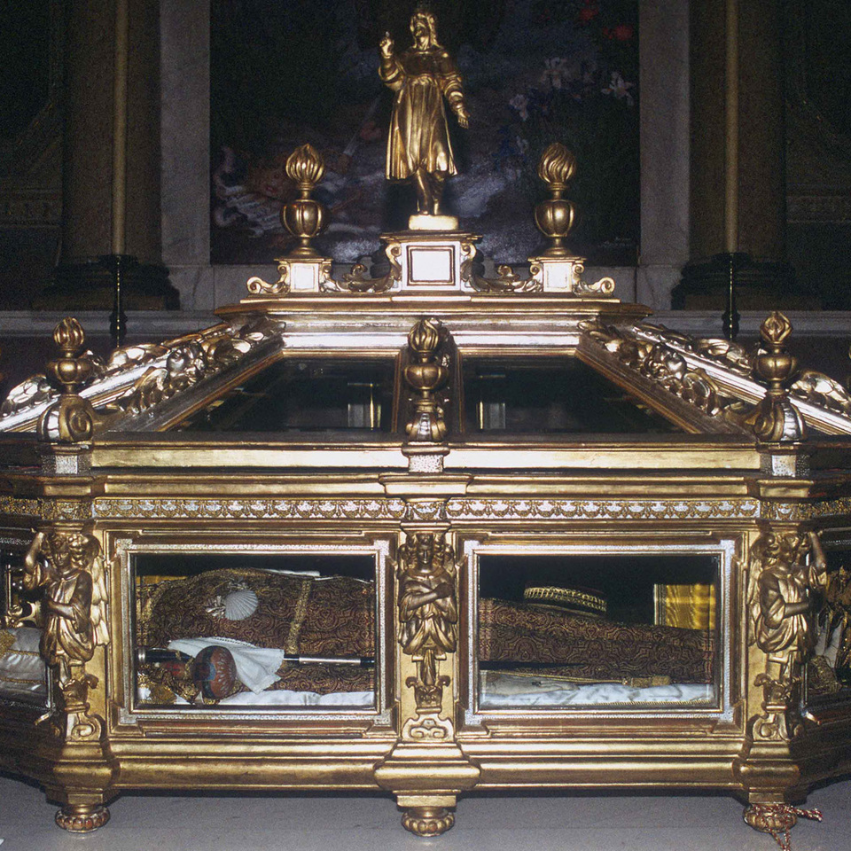 Vestito da pellegrino, con il bastone, la conchiglia e la borraccia, è esposto alla devozione entro una preziosa teca dorata. L'arca di legno è opera dello scultore Giovan Battista Turcazzano (sec. XVII).