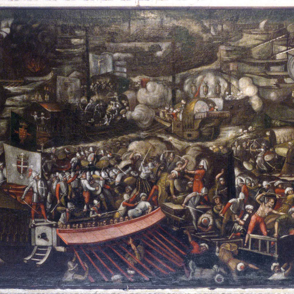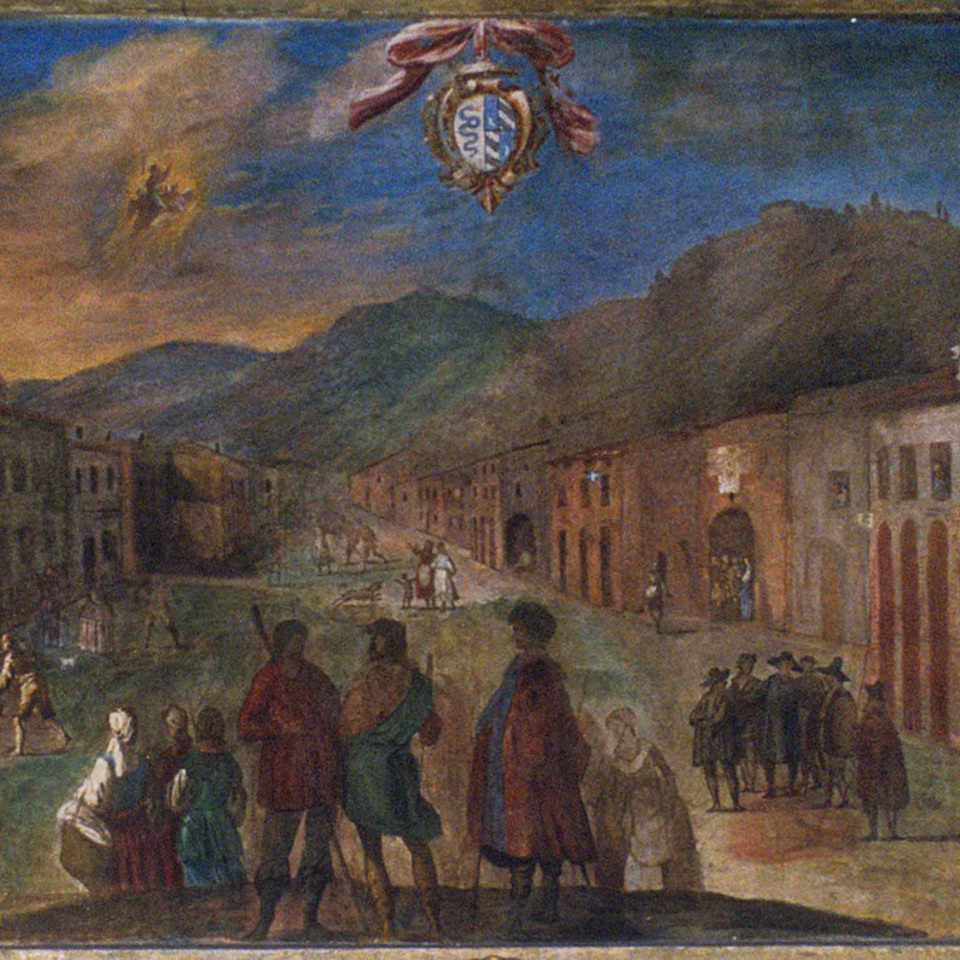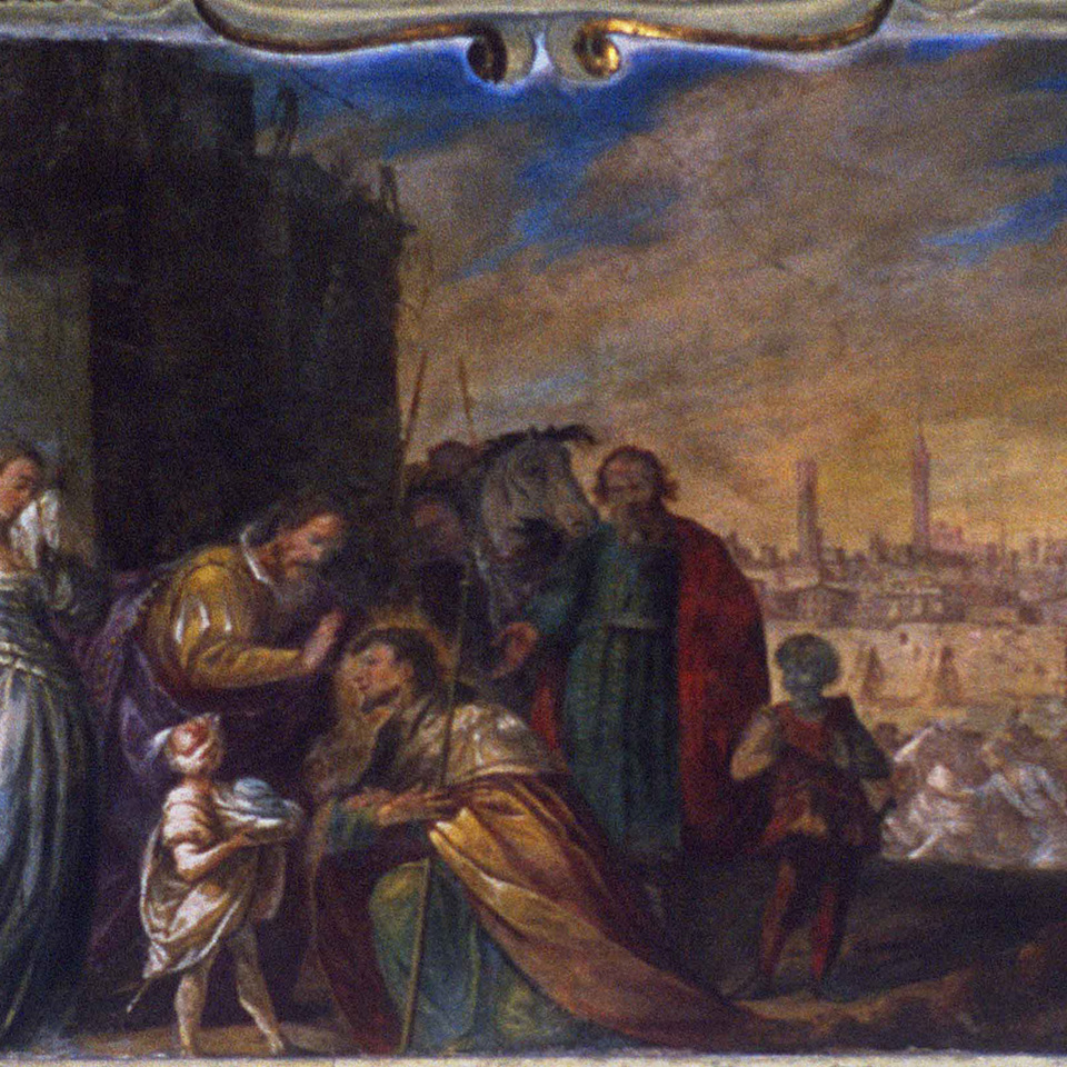 - Contardo riceve la benedizione paterna prima della partenza. (Sullo sfondo una veduta della città di Ferrara)
