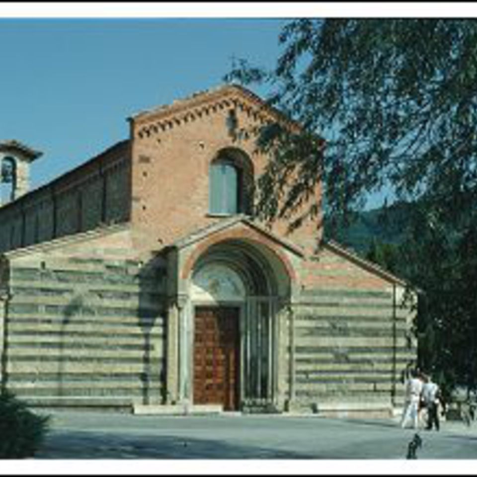 L'attuale edificio romanico risale alla fine del XII secolo. La facciata a salienti presenta nella parte inferiore un rivestimento in pietra arenaria a fasce orizzontali bicrome, mentre la parte superiore resta in cotto a vista con archetti pensili nella cuspide centrale, tipico del romanico padano. Al centro si apre un unico portale con protiro aggettante su due slanciate colonne che poggiano su plinti con teste d'ariete angolari. Gli stipiti sono ribattuti con riquadri a bassorilievi figurati e capitelli compositi con figure di telamone, mentre le esili colonnine della profonda strombatura terminano con capitelli a rocchetto. Nella lunetta un affresco seicentesco con San Francesco, la Madonna ed il Bambino.
