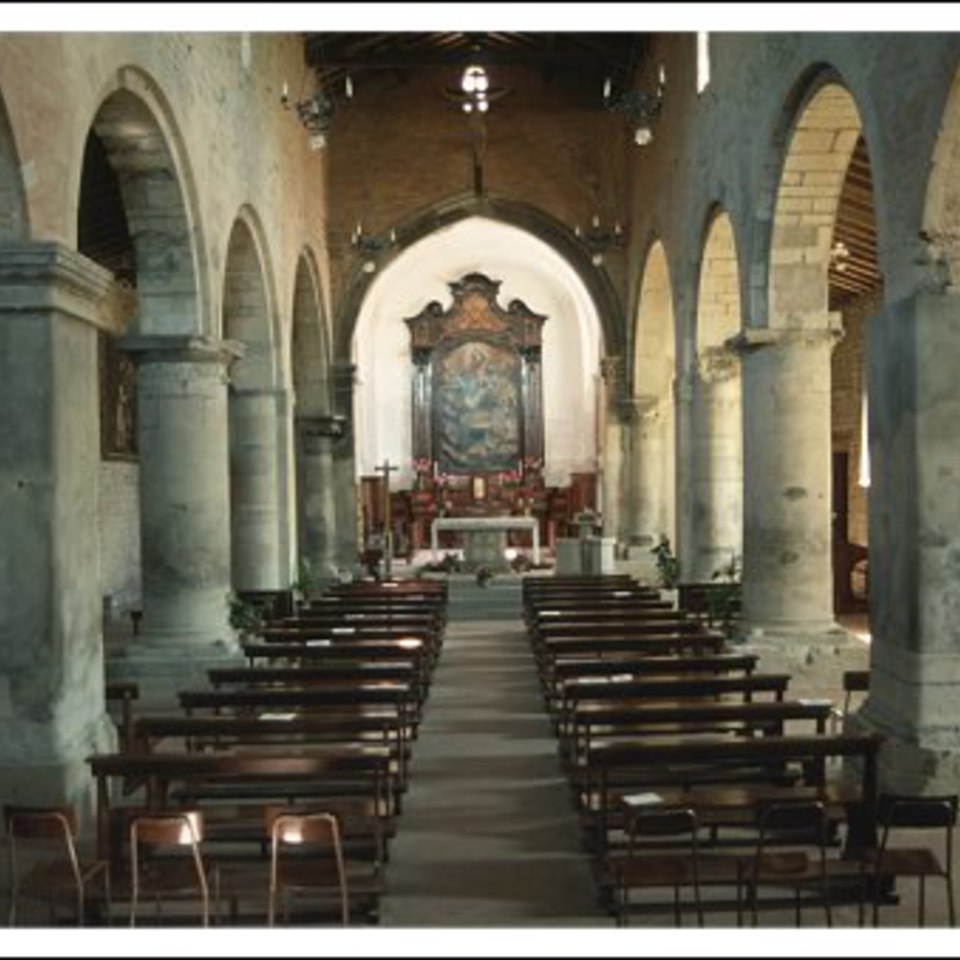 L’interno è a tra navate con il soffitto è a capriate. Sull'arco trionfale, a destra, resta un frammento dell'Annunciazione, affresco del XV sec. eseguito da Franceschino e Manfredino Boxilio. La pala d'altare rappresenta la Madonna della Neve col Bambino tra due santi.