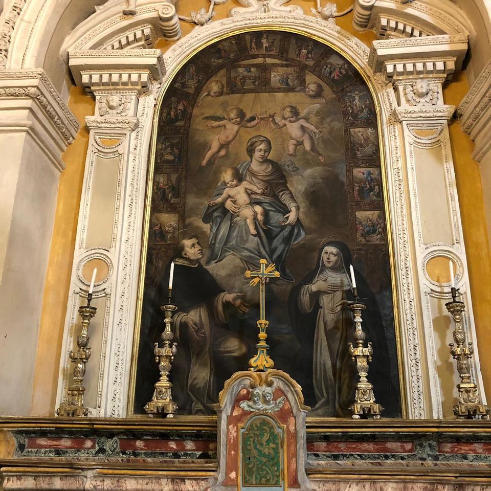 L’altare maggiore è in marmo, realizzato nella seconda metà del Settecento, in quanto nel 1765 mons. Avogadro visita ancora il grande altare ligneo barocco scolpito dorato e con figure, con il quadro della SS. Trinità e Maria Vergine e recante lo stemma della famiglia Dalla Chiesa Di Cinzano. L’altare laterale di sinistra è dedicato alla Madonna del S. Rosario e presenta un dipinto della Vergine con il Bambino tra San Domenico e Santa Caterina, attribuibile all’ambito di Lorenzo Guala, padre del più famoso pittore Pier Francesco, realizzata posteriormente al 1660 in sostituzione di una più antica e descritta da mons. Dalla Chiesa nella visita del 1735. Il pittore risulta essere firmatario della pala di fronte rappresentante S. Antonio da Padova e il diacono S. Vincenzo martire (da Saragozza).