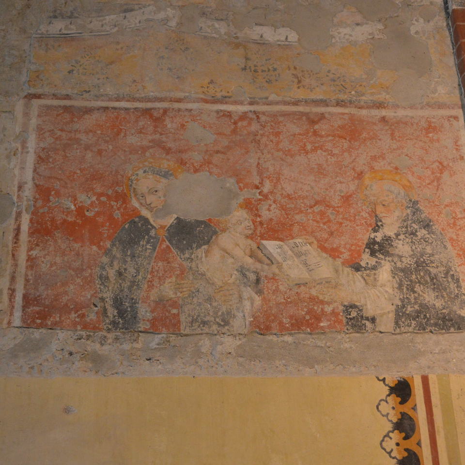 scendendo fino all’importante capitello cubico di cui è stata recuperata la decorazione originaria. Il restauro ha inoltre riguardato l’affresco – attribuito alla Scuola di Jacopo Jaquerio probabilmente realizzato dai Serra di Pinerolo – che necessitava di una ripresa dopo il primo intervento eseguito alcuni decenni prima.