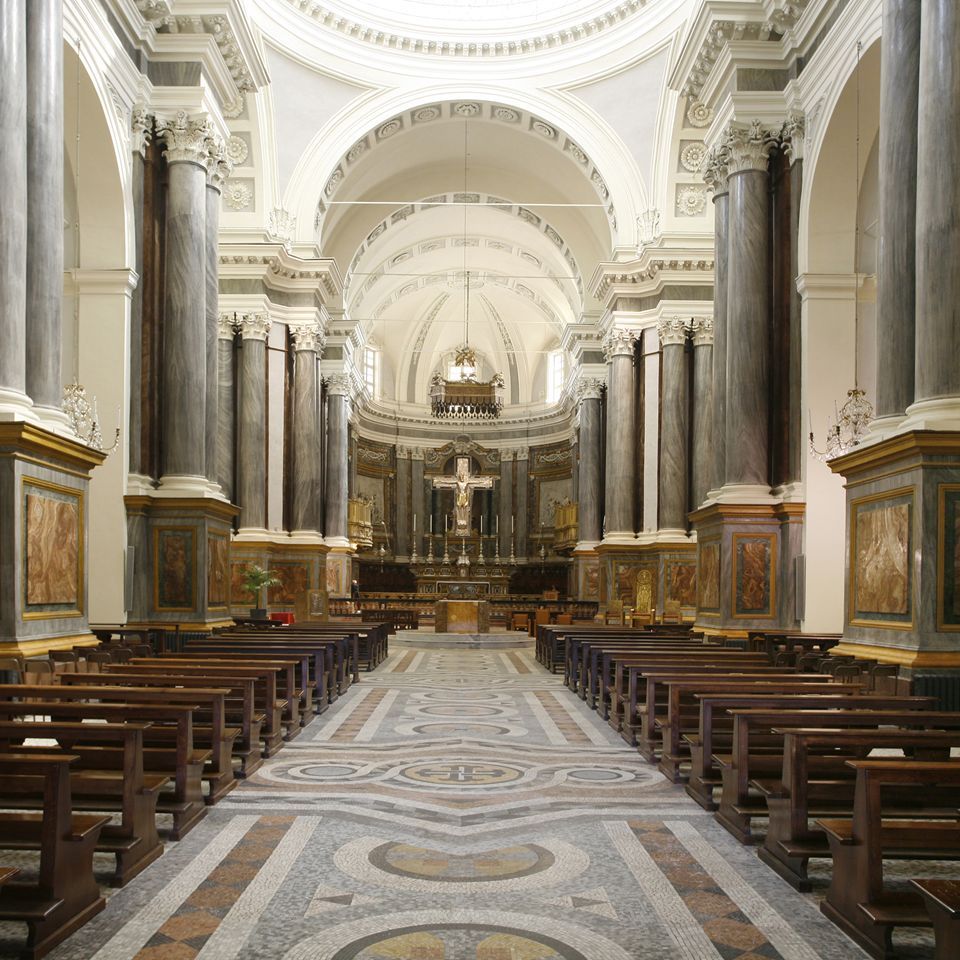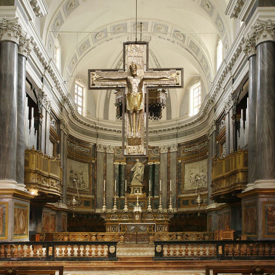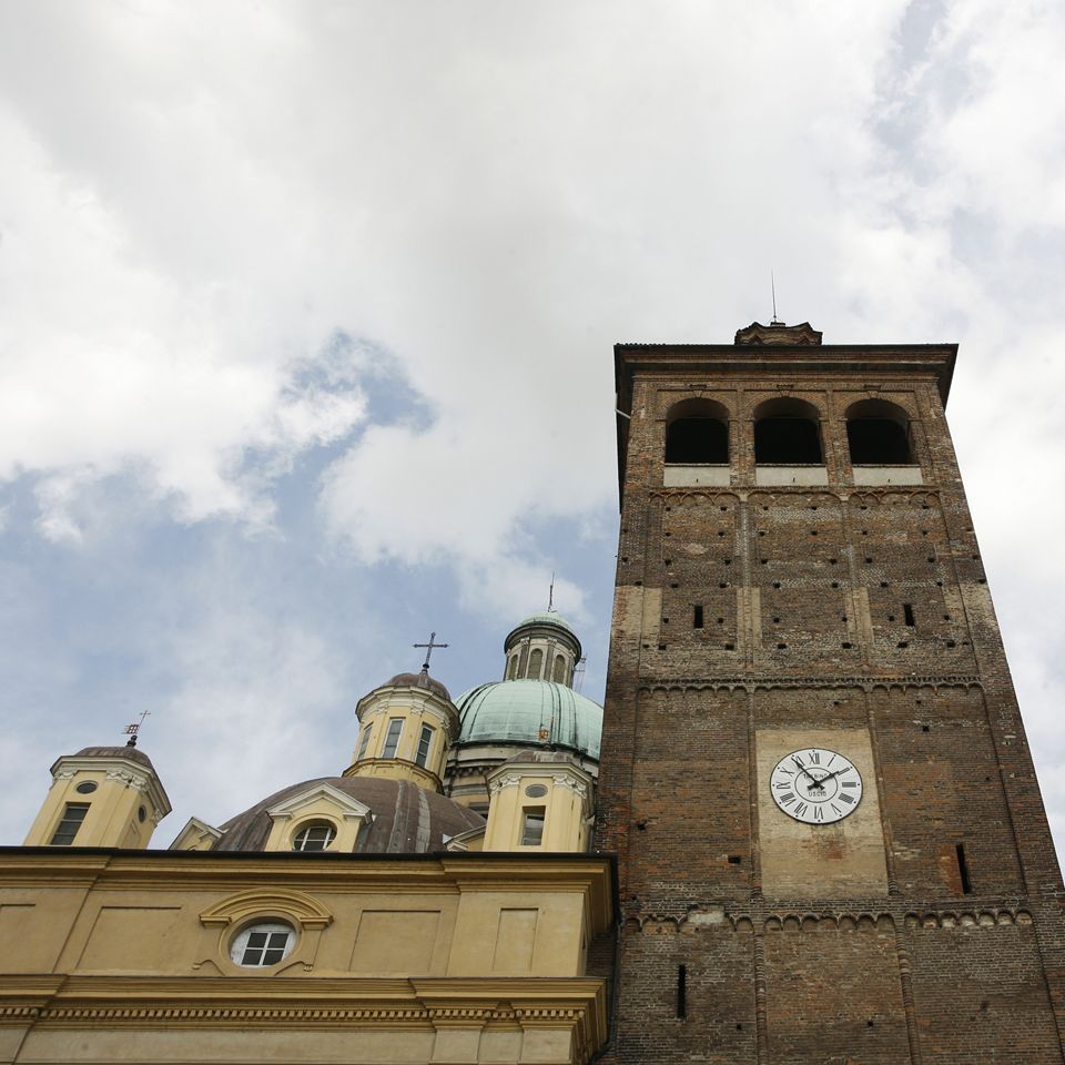 La Cathédrale actuelle de Sant’Eusebio de Vercelli a été reconstruite en 1570 par ordre du Cardinal Giulio Ferrero à l'emplacement d'une précédente basilique paléochrétienne. Le corps du saint qui est encore aujourd'hui conservé à l'intérieur de la cathédrale, a été retrouvé en 1581. L'abside de la structure actuelle remonte au XVIe siècle alors que les nefs et le transept sont du XVIIIe et la coupole du XIXe. Des interventions de restauration ont été engagées dès la moitié du XXe siècle mais les travaux les plus importants ont été entrepris en 2009 par l'archevêque Enrico Masseroni et se sont achevés en 2012. De l'extérieur, l'édifice frappe par son imposante façade; exécutée par Benedetto Alfieri au XVIIIe siècle, elle est surmontée par les gigantesques statues des douze Apôtres et du Rédempteur et de leurs attributs respectifs ( XIXe siècle). Le plan de l'église est en forme de croix latine à trois nefs, une centrale et deux mineures, divisées en cinq travées avec des voûtes en coupole, soutenues par des piliers massifs surmontés de colonnes en faux marbre. Dans l'abside, s'élève la grande coupole et le précieux Chœur en bois et aussi le crucifix monumental de période romane (Xe siècle) réalisé en bois recouvert d'une feuille d'argent travaillée au poinçon sur le côté face. La cathédrale possède un nombre considérable de chapelles avec des autels mineurs parmi lesquelles celle dédiée à Amédée IX de Savoie, le bienheureux et celle de la Madone, dite “ de la gifle”. Le seul vestige de l'ancienne cathédrale est l'imposant clocher d'époque romane ( XIIe siècle): de forme carrée, les fondations sont en vieilles pierres de taille et il est divisé à l'horizontale, en quatre parties définies par des rangées d'arceaux entremêlés et, à la verticale, des demi-colonnettes le partagent en trois zones. La partie la plus récente du clocher est caractérisée par une large chambre des cloches fermée sur chaque côtés par trois arcs rampants.
