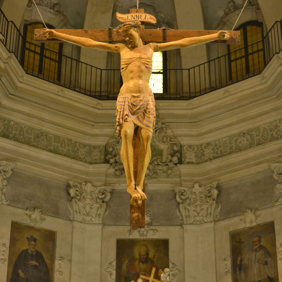 All'interno della chiesa fulcro devozionale è l'antico crocifisso risalente al XIV secolo , un vero capolavoro ligneo, appeso sopra l’altare. Prima dei restauri era coperto da vari strati di calce, per protezione, pare, contro tarli e fumi candele. La prima particolarità a essere notata è la mancanza delle dita, dovuta al fatto che essere furono tagliate in funzione di una collocazione in una nicchia della chiesa negli anni Trenta del secolo scorso.