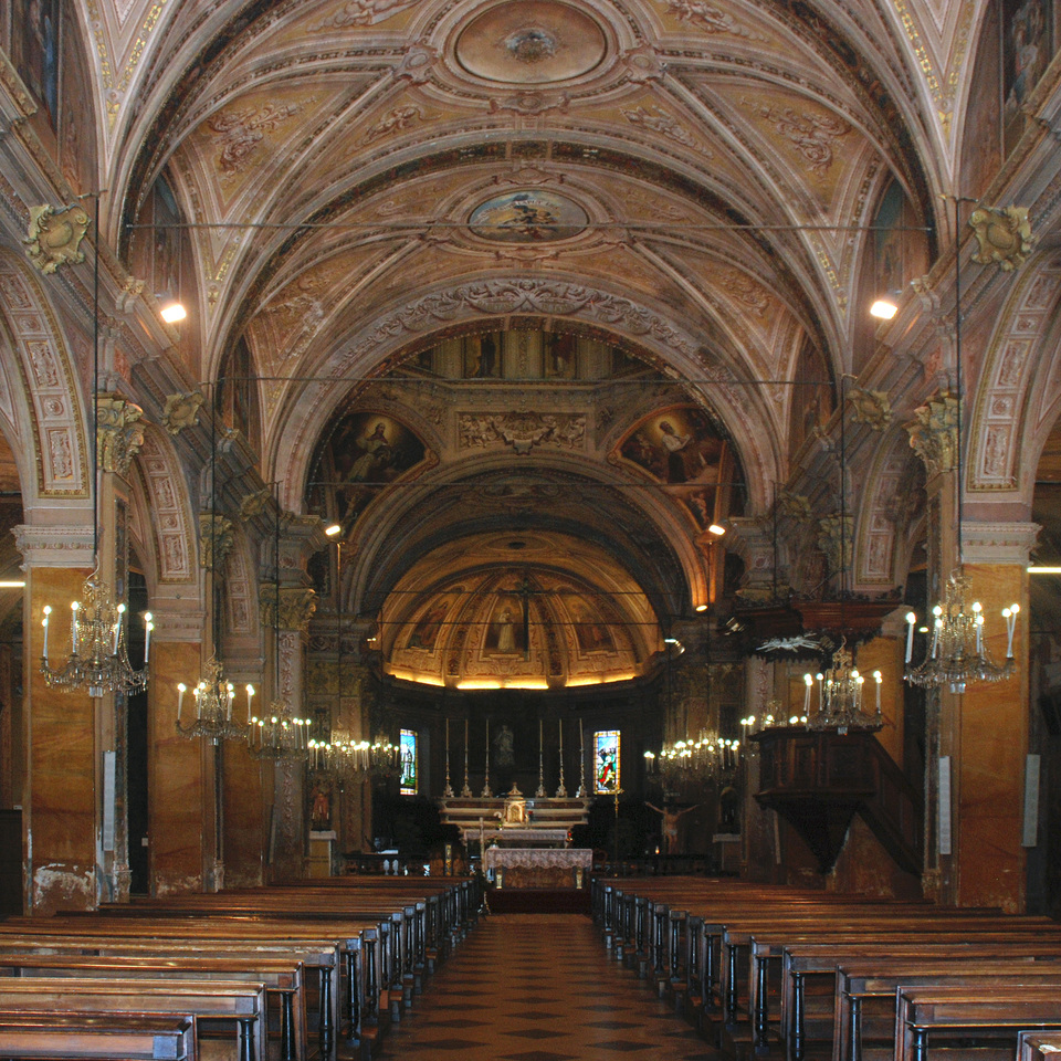 La chiesa è ricca di opere d’arte: un leone alato quattrocentesco che rimanda alla Serenissima, opere scultoree vasariane e di Anton Maria Maragliano (1664-1741) e opere pittoriche di Gulglielmo Caccia detto il Moncalvo (1568-1625). Si segnala il crocifisso ligneo scampato all'incendio del 1651 e un piccolo affresco tardo-trecentesco raffigurante San Rocco e San Sebastiano.