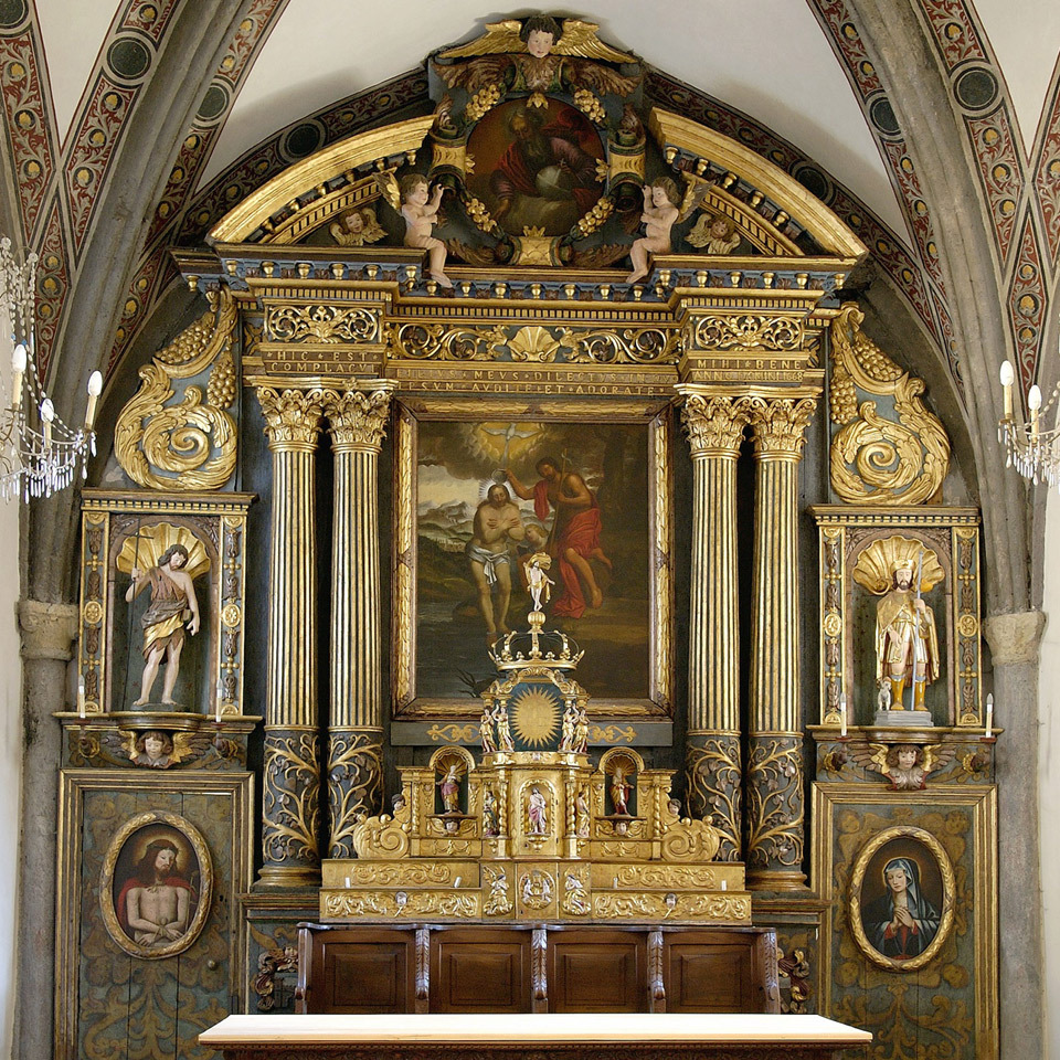 La parrocchiale di San Giovanni Battista è una delle più antiche della Valle di Susa. La sua prima attestazione documentaria risale al 1057, anno in cui viene donata da Adelaide di Susa e dal marito alla vicina pieve di San Lorenzo di Oulx. Nel 1749 la chiesa passa sotto la prevostura di Pinerolo per poi rientrare nei territori della Diocesi di Susa nel 1794. L’edificio di età romanica viene rimaneggiato tra XVI e XVIII secolo. La facciata della chiesa si presenta con un profilo a salienti, con archetti trilobati in pietra sul fronte principale e archetti semicircolari sui fronti laterali. Alla facciata è addossato un protiro monumentale con profilo a capanna, segnato da una serie di archetti trilobati inclinati, che si ripetono sulle pareti laterali. L’arcata frontale è sostenuta da due robusti pilastri ottagonali, con capitelli a piramide tronca rovesciata su cui si legge la data 1536, anno di realizzazione del protiro. Il portale in pietra, costruito nel 1512 dallo scultore di Melezet, Matheus Rode, come si legge sul fregio scolpito, incornicia la porta di ingresso. Nella lunetta sopra l’architrave monolitico si trova l’affresco del Compianto sul Cristo morto. Le tre edicole con baldacchini, sopra l’arco a fiamma, poste ai lati e sopra il portale, ospitavano le statue dell’Arcangelo Gabriele, della Vergine e la Colomba dello Spirito Santo. All’esterno, sulla fiancata meridionale, è presente il ciclo dei Vizi, Virtù e Pene Infernali risalente ai primi anni del XVI secolo. La scena si dipana lungo tre registri orizzontali sovrapposti: in quello superiore sono presenti le Virtù, nel mediano i Vizi, nella fascia inferiore, purtroppo molto rovinata, si trovano raffigurate le Pene Infernali. L’interno della chiesa è a tre navate coperte da volte a crociera costolonate e suddivise da arcate a sesto spezzato. L’intera struttura è impreziosita da un ricco apparato scultoreo lapideo: pilastri e capitelli, decorati con teste umane, animali, figure vegetali e geometriche. I capitelli del coro sono tra i più antichi e sono datati all’inizio dell’XI secolo e, insieme agli altri elementi in pietra, sono stati reimpiegati all’inizio del XVI secolo nel rifacimento della chiesa. L’altare maggiore ospita il retablo ligneo realizzato Jean Faure di Thures nel 1667; ai lati dell’altare, San Giovanni Battista e San Sebastiano affrescati dal pittore Giovanni Vacchetta nel 1909. Nella navata destra, si trovano gli affreschi raffiguranti le scene della Vita di Sant’Antonio abate e i Santi Cosma e Damiano, Rocco e Colombano, opera del pittore aviglianese Johannes Dideri che li realizzò nel 1508. Nella Cappella del Rosario, nelle vele della volta, sono raffigurate la Madonna della Misericordia e l’Assunta; sulla parete, parte della Natività e della Presentazione al Tempio di Gesù. Nella testata della navata sinistra un altro affresco rappresentante la Vergine e San Giovanni evangelista, datata al tardo Trecento, cui si sovrappone un’altra Pietà del pittore Dideri. Sempre del medesimo autore è il Miracolo di Sant’Eligio posto alla metà della navata. In controfacciata si trova la raffigurazione del Giudizio Universale.