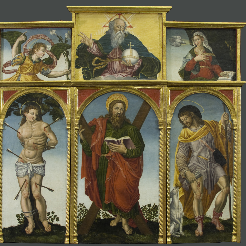 - Il Trittico con San'Andrea apostolo tra i Santi Sebastiano e Rocco (datato1604) proveniente dalla chiesa parrocchiale di Sant'Andrea Apostolo di Agneto, frazione di Carrega Ligure