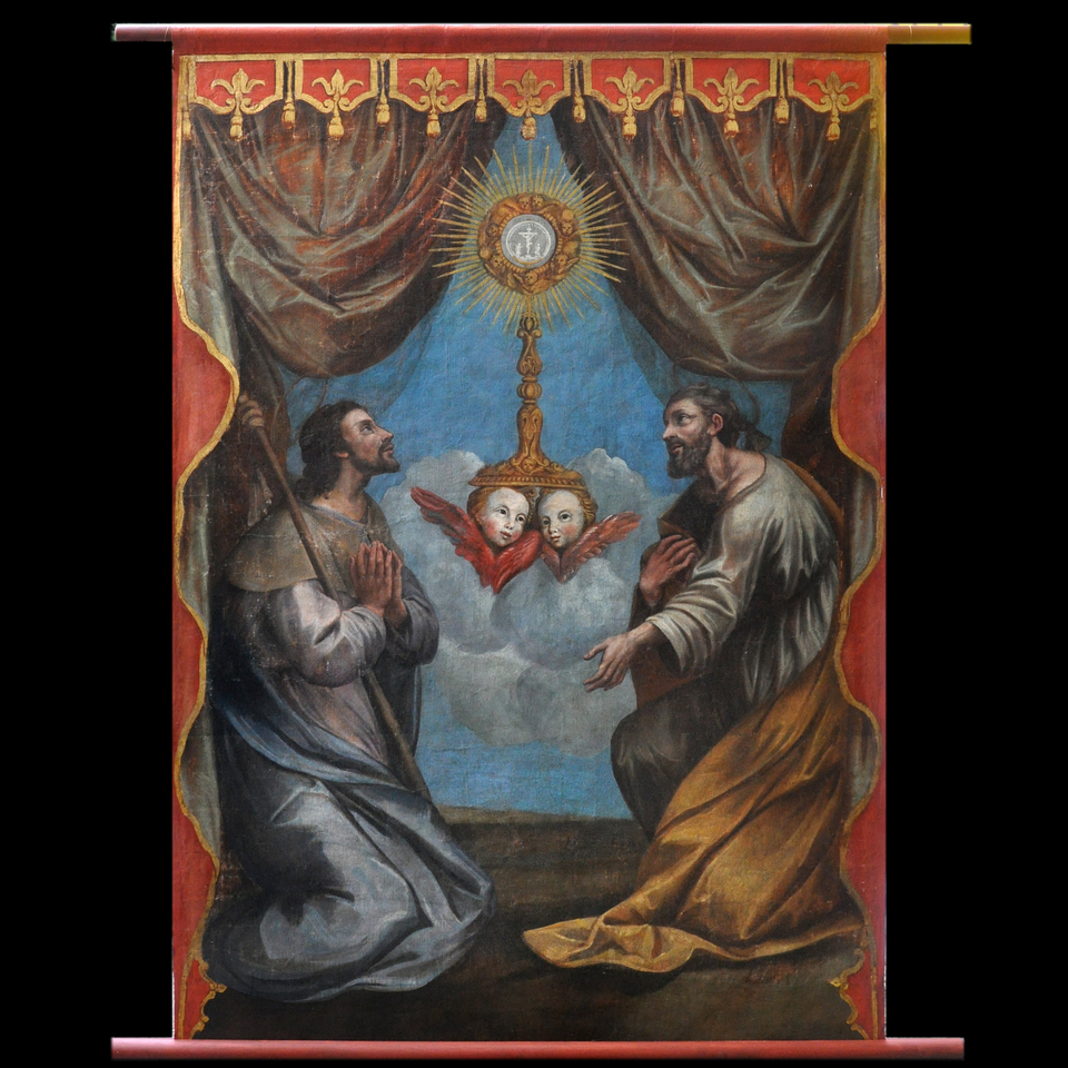 - Un parato liturgico in damasco rosso proveniente dalla chiesa parrocchiale di San Giuliano Martire di Carrega Ligure, composto da 1 pianeta, 2 tonacelle, 2 stole, 1 manipolo (sec. XVII)