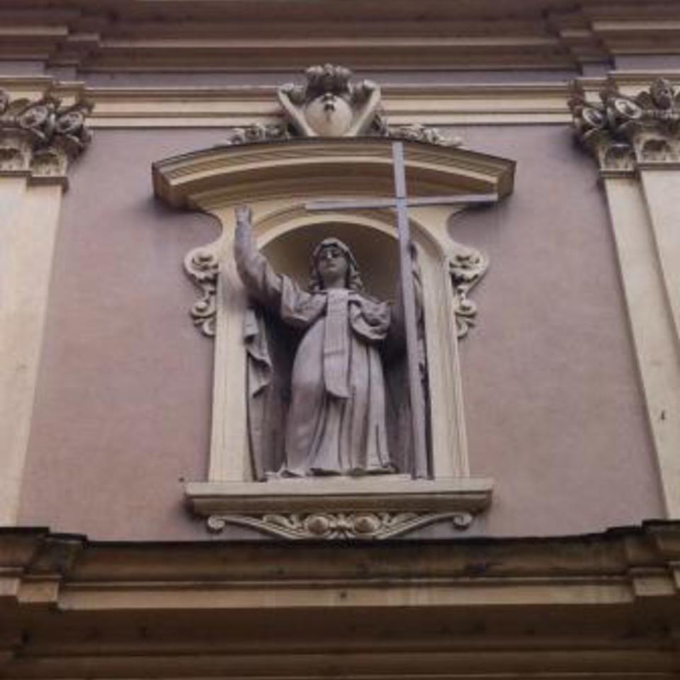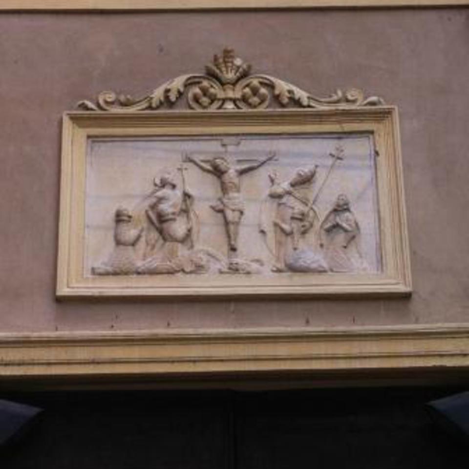 Sopra il portone di ingresso alla chiesa, architravato, vi è l'altorilievo tardocinquecentesco del Crocifisso. Ai piedi, altre quattro figure genuflesse, confratelli e consorelle, in abito confraternale dell'epoca. La collocazione dell'opera non è casuale. Essa è sulla facciata proprio sotto la raffigurazione della Carità: il sacrificio di Cristo è espressione definitiva del Mistero pasquale, compendio e fonte delle virtù teologali. È di grande valore simbolico. La porta della chiesa non è unicamente l'ingresso dell'edificio: è una soglia di salvezza. Ricordiamoci che il nome “Gesù” in ebraico (Yeshua, forma ridotta di Ye'hoshua) vuoi dire “Salvatore”, e che il Signore ha usato altre volte la similitudine della “porta” in riferimento alla salvezza ed alla vita cristiana: “Entrate per la porta stretta, perché larga è la porta e spaziosa la via che conduce alla perdizione, e molti sono quelli che entrano per essa; quanto stretta invece è la porta e angusta la via che conduce alla vita, e quanto pochi sono quelli che la trovano”. Peraltro, la simbologia della porta è presente in civiltà antiche, ma anche moderne: delimitando spazi sacri e profani, un po' in ogni tempo ed in ogni luogo la porta ha assolto la sua funzione separando simbolicamente il mondo delle tenebre da quello della luce, impedendo o consentendo l'accesso al mistero, il superamento dei limiti dell'io, l'affacciarsi sull'assoluto. Dopo aver oltrepassato la “soglia” si entra nell'edificio e si incontra subito l'acquasantiera, a forma di conchiglia. La conchiglia ha un grande valore simbolico e denota anche un modello di comportamento: raffigura, infatti, una mano aperta che dona l'acqua. Da una parte, ci richiama subito il Battesimo; dall'altra, ci ricorda le opere di misericordia. Non va dimenticato che, secondo la tradizione riportata anche da Jacopo di Varagine, era utilizzata dal Battista per battezzare.