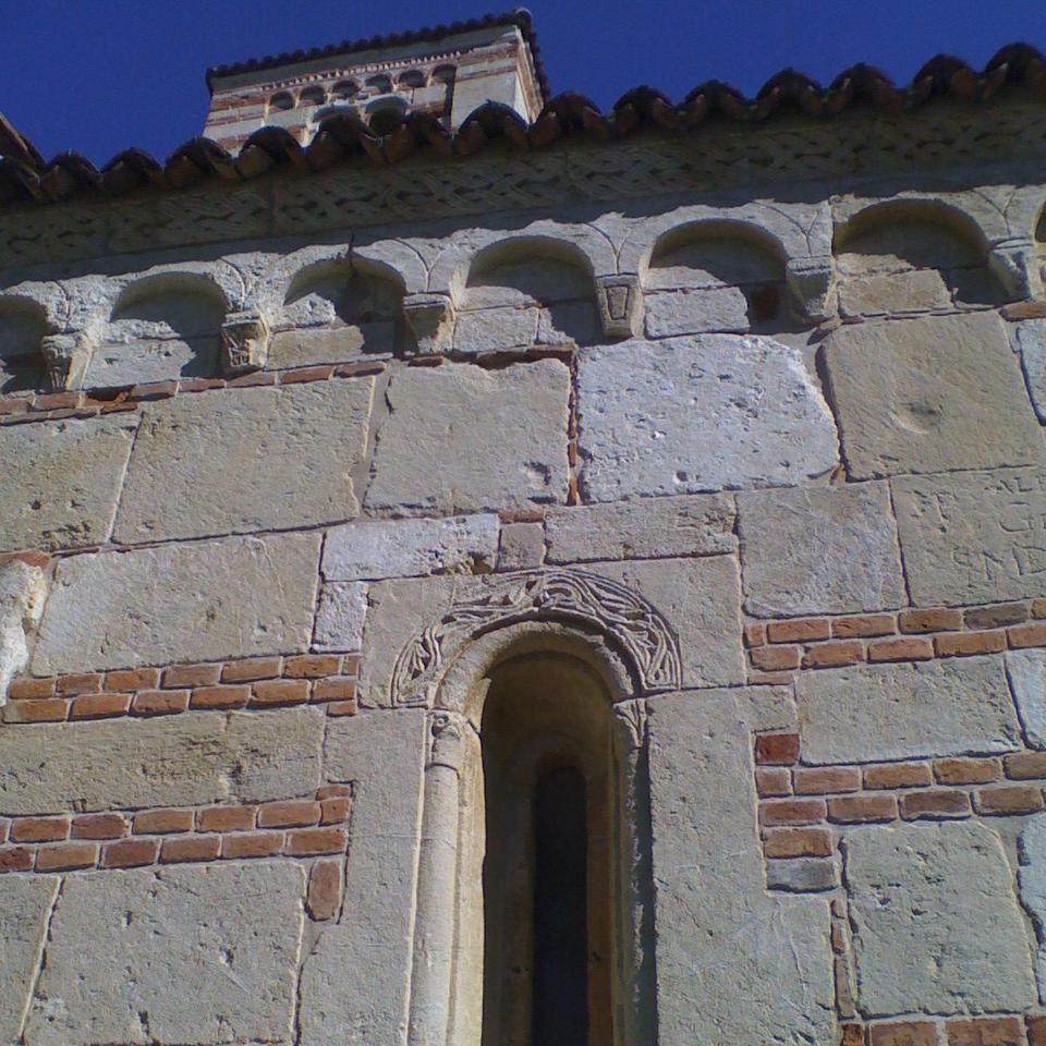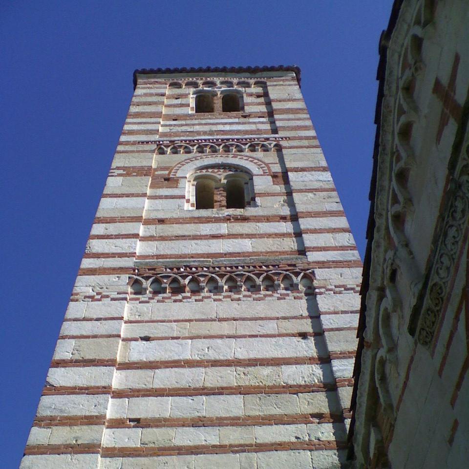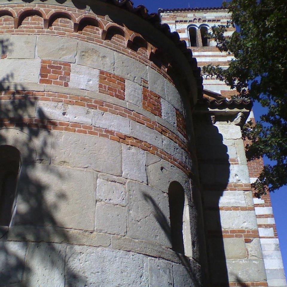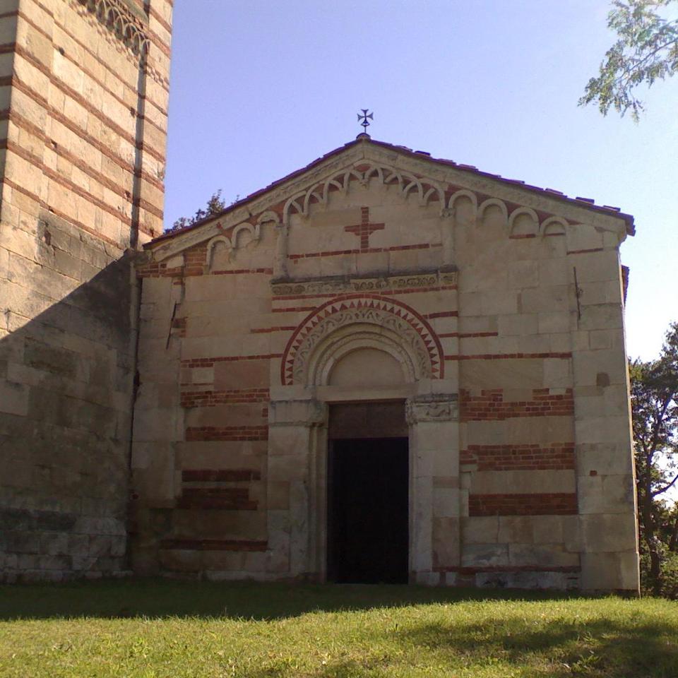 All'esterno nella tessitura muraria della chiesa e del campanile tra le decorazioni si ammirano archetti pensili semplici ed intrecciati in conci di pietra e laterizi, cornici e ghiere in pietra modanate e scolpite a bassorilievi, capitelli scolpiti, decorazioni a “denti di lupo” e “denti di sega”.