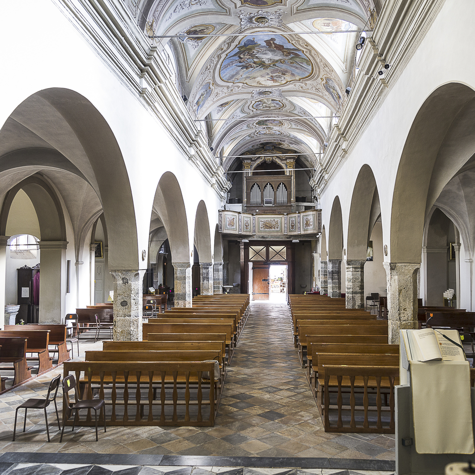 La visita pastorale del 1583 di Mons. Scarampi la descrive a tre navate, sorrette da colonne in pietra, le cappelle di sant’Antonio e san Bernardo affrescate e con un grande crocefisso che pendeva dalla volta davanti al presbiterio.