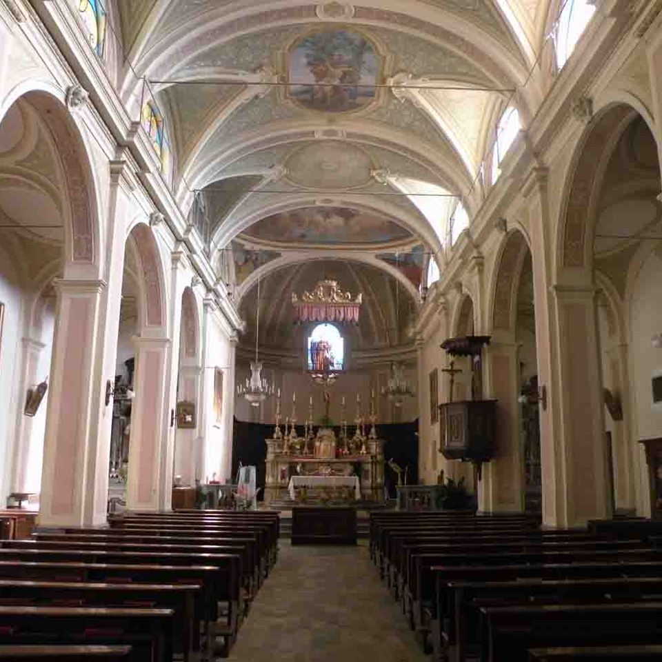 Le visite pastorali del XVII e del XVIII sec. descrivono l’aula di forma rettangolare a tre navate con gli altari del Rosario, del Suffragio, di San Francesco e Sant’Antonio da Padova, di San Bovo e San Mauro, di Sant’Orsola e di Santa Maria del Carmelo, mentre nel 1699 viene eretto su commissione del conte Andrea Traiano Roero l’altare di San Giuseppe.