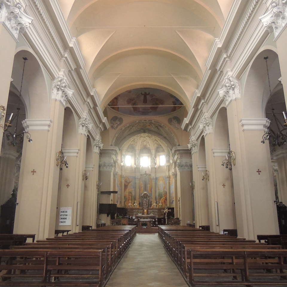 La Chiesa Parrocchiale di San Francesco d’Assisi sorge all’estremità sud-est dell’abitato, su un rilievo detto Monteguardo o Belvedere. Fu edificata dai Minori Conventuali forse nel 1272, con l’aiuto di Guglielmo VII, Marchese del Monferrato. Nel 1644 buona parte della chiesa era crollata e fu ricostruita conservando il coro secondo il progetto del frate Vincenzo Rovere. Nella seconda meta del XVIII secolo furono rifatti gli altari laterali e nel 1783 divenne parrocchiale definitiva. L’attuale facciata fu realizzata nel 1932 su progetto dell’architetto Vittorio Mesturino, che riprese i disegni antichi. Essa è a due ordini, di cui quello inferiore è diviso da lesene in tre parti, ciascuna con una porta sormontata da una statua: al centro l'Immacolata con due angeli; a destra S.Francesco; a sinistra S.Antonio da Padova. Radicali restauri furono operati nel 1943-44. Le parti più antiche presentano caratteri stilistici del XIV secolo; vi corrispondono le tre absidi, la sacrestia con l’attiguo piccolo chiostro e parte del campanile, quest’ultimo alto 45 metri. L’interno, di ampie dimensioni (m 57x23 e m 19 di altezza), e suddiviso in tre navate divise da cinque colonne per parte. Di Mario Micheletti sono gli affreschi rappresentati il Cantico delle Creature nella cupola centrale e le Storie della Salvezza nell'abside; allo stesso artista si devono le stazioni della Via Crucis su tavola poste sui pilastri centrali. Sul soffitto del presbiterio si trovano stucchi di fine XVI secolo, mentre l'altare maggiore fu costruito nel 1774 sul sito del primitivo sepolcro dei marchesi del Monferrato. Notevoli sono il coro semicircolare in noce e la balaustra marmorea finemente lavorata. Le cappelle laterali custodiscono opere del Moncalvo, tra le quali le tele raffiguranti il Martirio di S.Orsola e l’Adorazione dei Magi e l’ affresco il riposo di San Rocco. Di Orsola Caccia sono invece i dipinti Natività del Battista e Cristo coronato di spine. In capo alla navata destra c'è la cappella dell'Immacolata, con due tele di Orsola Caccia raffiguranti S. Antonino martire, e la Sacra Famiglia con S. Orsola; nella nicchia centrale è collocata una statua dell'Immacolata, qui portata nel 1882. In sacrestia si conservano mobili intagliati e varie tele, tra cui Madonna in trono col Bambino e i SS. Martino e Rocco” di Bartolomeo Bonone, S. Luca nello studio, di Orsola Caccia (il volto del santo sarebbe un ritratto del padre) e Cristo nel deserto servito dagli angeli, di Guglielmo e Orsola.