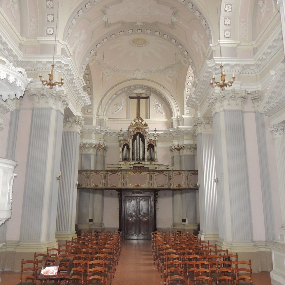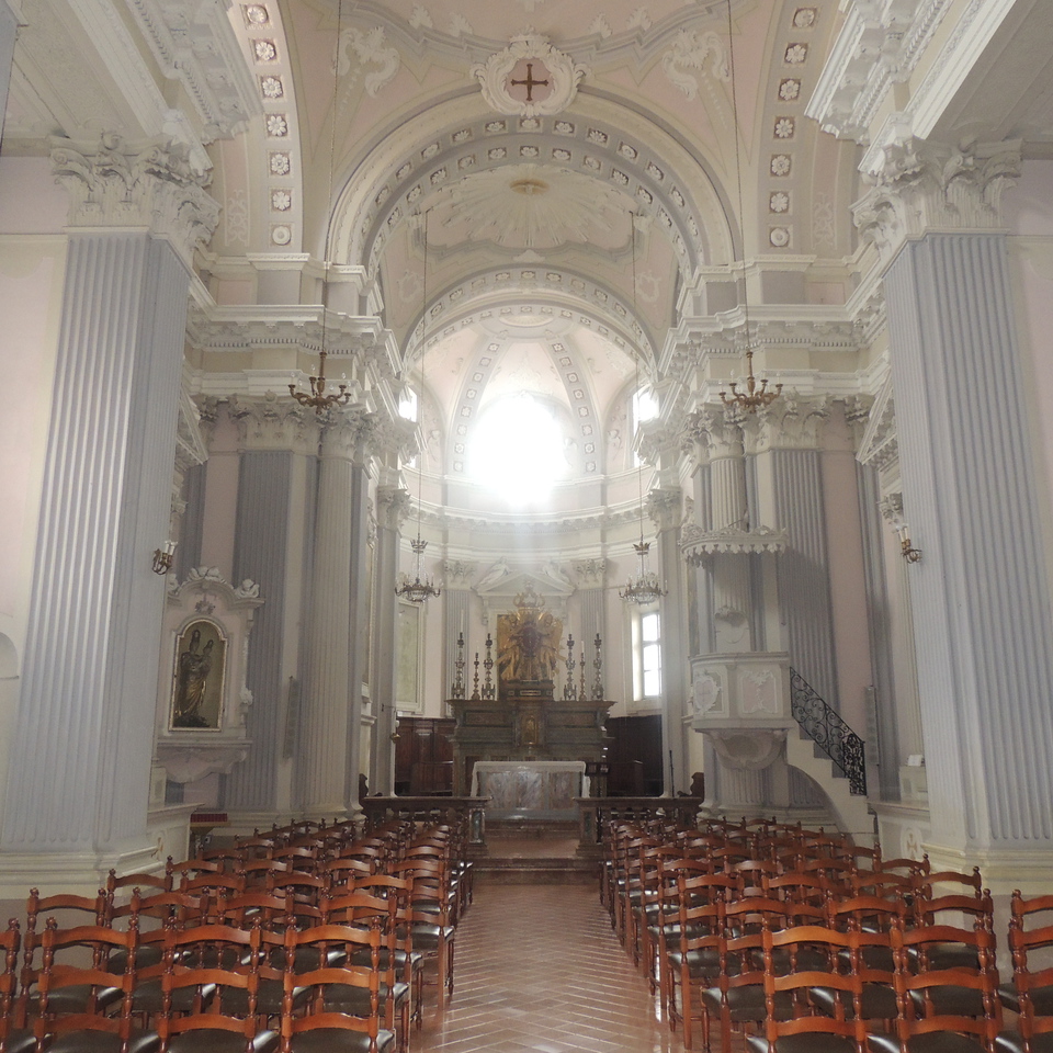 La facciata in cotto (il progetto ne prevedeva l’intonacatura) è ancora di impostazione barocca, la parte centrale lievemente aggettante è contraddistinta da due ordini sovrapposti di sei colonne ioniche, culminanti con un timpano triangolare sullo sfondo di un alto attico. Il portone ligneo, intagliato e scolpito, è coevo della chiesa.