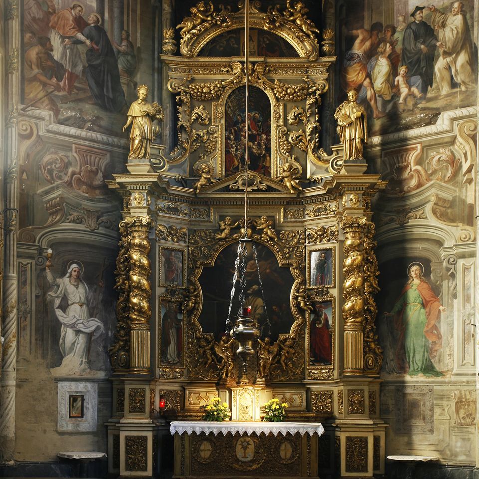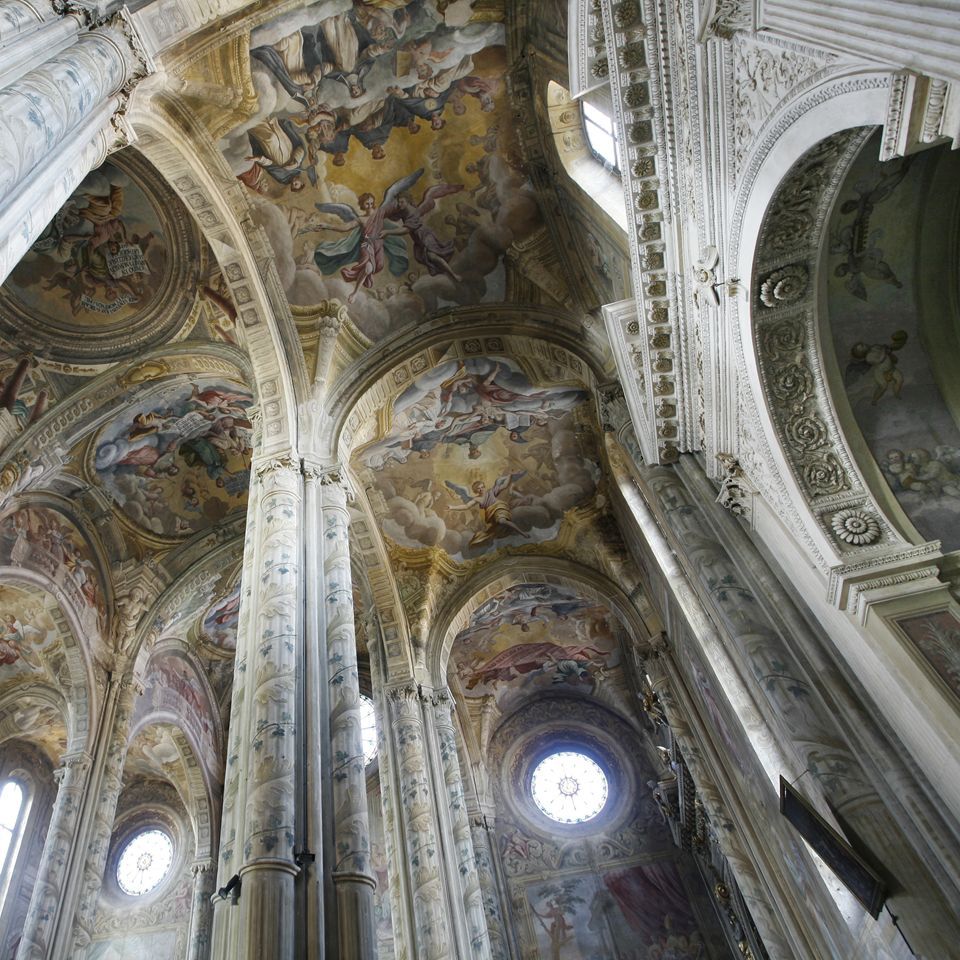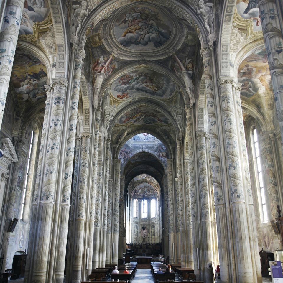 La navata settentrionale ospita tre cappelle, quella di S. Teobaldo e S. Secondo, quella di S. Giovanni Battista e la cappella di S. Giuseppe o dello Sposalizio, con altari barocchi di pregevole fattura, sormontati da importanti tavole; in particolare nella cappella intitolata a S. Giovanni Battista è possibile ammirare la Madonna in trono tra Santi mentre nella cappella di S. Giuseppe lo Sposalizio della Vergine, entrambe opere di Gandolfino da Roreto. Nella navata sinistra è collocato il Compianto sul Cristo morto, gruppo scultoreo del Cinquecento in terracotta. In prossimità dell’ingresso sono collocate vasche lustrali su capitelli romani, una datata 1229, ed il fonte battesimale del 1468. Il transetto termina a sinistra con la cappella della SS. Trinità e di S. Francesco di Sales, mentre a destra con la cappella di S. Filippo Neri, destinata alla custodia eucaristica, che ospita il polittico smembrato della Genealogia della Vergine con Santi e la lunetta della Deposizione, opere anch’esse di Gandolfino da Roreto. La navata settentrionale termina con la cappella della Madonna Grande, un tempo dell’Epifania, con altare marmoreo e statua dell’Assunta in rame argentato e dorato, opere realizzate dall’orafo Tommaso Groppa nel primo decennio del Settecento. La cappella ospita affreschi di fine Settecento di Carlo Innocenzo Carloni, l’Adorazione dei Magi ed il Trionfo della Religione e finte architetture di Pietro Antonio Pozzo. La navata meridionale termina con la cappella dell’Ascensione o della Madonnina con altare settecentesco proveniente dalla Certosa di Valmanera e con affresco quattrocentesco. Al centro del presbiterio si trova l’altare maggiore in marmi policromi eseguito da maestranze lombarde nel 1732 su progetto dell’architetto Benedetto Alfieri, con indorature della bottega degli orafi Groppa. Alle spalle dell’altare si trovano gli stalli corali rococò terminati nel 1771 dallo scultore ebanista Giuseppe Giacinto Salario.