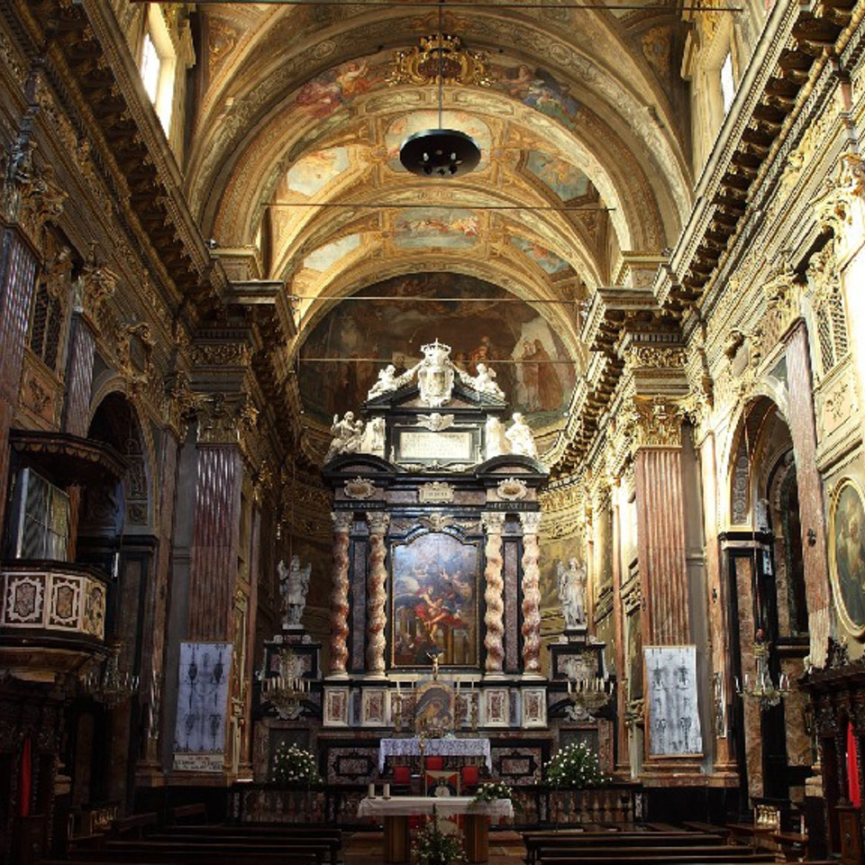 La facciata fu realizzata su progetto dei maestri luganesi tra cui Martino Solaro e Giacomo Papa e risulta conclusa già nel 1667. La navata interna è decorata con ricchi marmi policromi e coperta da una volta lunettata; su di essa si affacciano sei cappelle, con altari che erano di patronato di famiglie legate alla corte sabauda.
