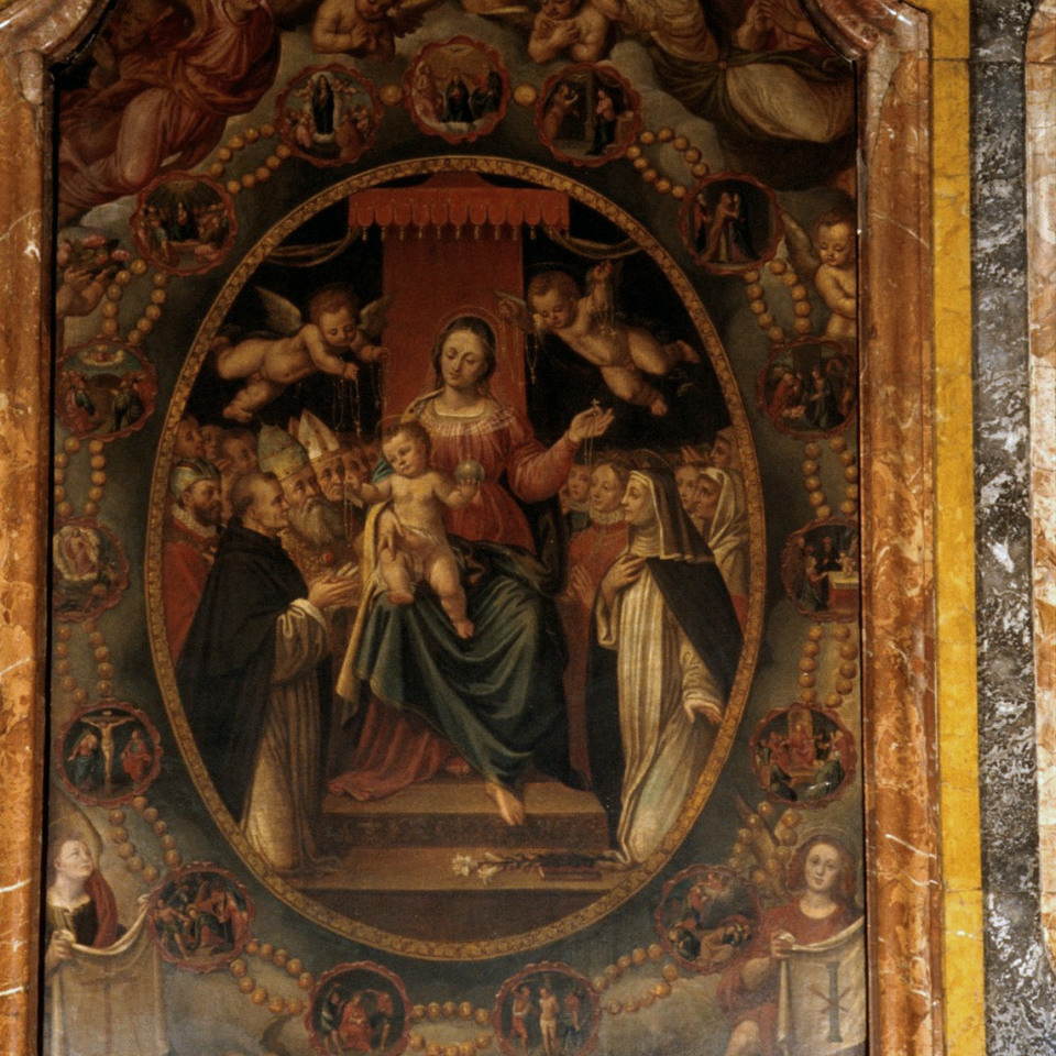 Il culto della Madonna del Rosario ha origine dai Padri Carmelitani, ordine originario del Monte Carmelo, considerato il giardino verdeggiante della Palestina. Qui, nel secolo XII, si raccolsero alcuni penitenti-pellegrini europei, fedeli al modello del profeta Elia. Costruita una chiesetta in mezzo alle celle, la dedicarono a Maria, sviluppando il senso di appartenenza alla Madonna come Signora del luogo e Patrona, e ne presero il nome, "Fratelli di Santa Maria del Monte Carmelo". L’Ordine Religioso fu riconosciuto da Innocenzo IV nel 1247 e fu inserito nella corrente degli Ordini Mendicanti. Verso il 1235 i Carmelitani dovettero abbandonare il luogo d'origine a causa delle incursioni dei saraceni che stavano riconquistando la Terra Santa, per cui ritornarono ai paesi di origine diffondendo il culto della Madonna del Carmine. Fu nel Medioevo che S.Beda il Venerabile aveva suggerito l'adozione di una collana di grani per conteggiare le preghiere. Nacque così la devozione alla corona del rosario, che ha il significato di una ghirlanda di rose offerta alla Madonna. La festa liturgica si celebra sia il 16 luglio per commemorare l'apparizione mariana che sarebbe avvenuta nel 1251 a San Simone Stock, all'epoca priore generale dell'ordine carmelitano, sia il 7 ottobre, data istituita da San Pio V in ricordo della vittoria riportata a Lepanto sui Turchi del 1571.