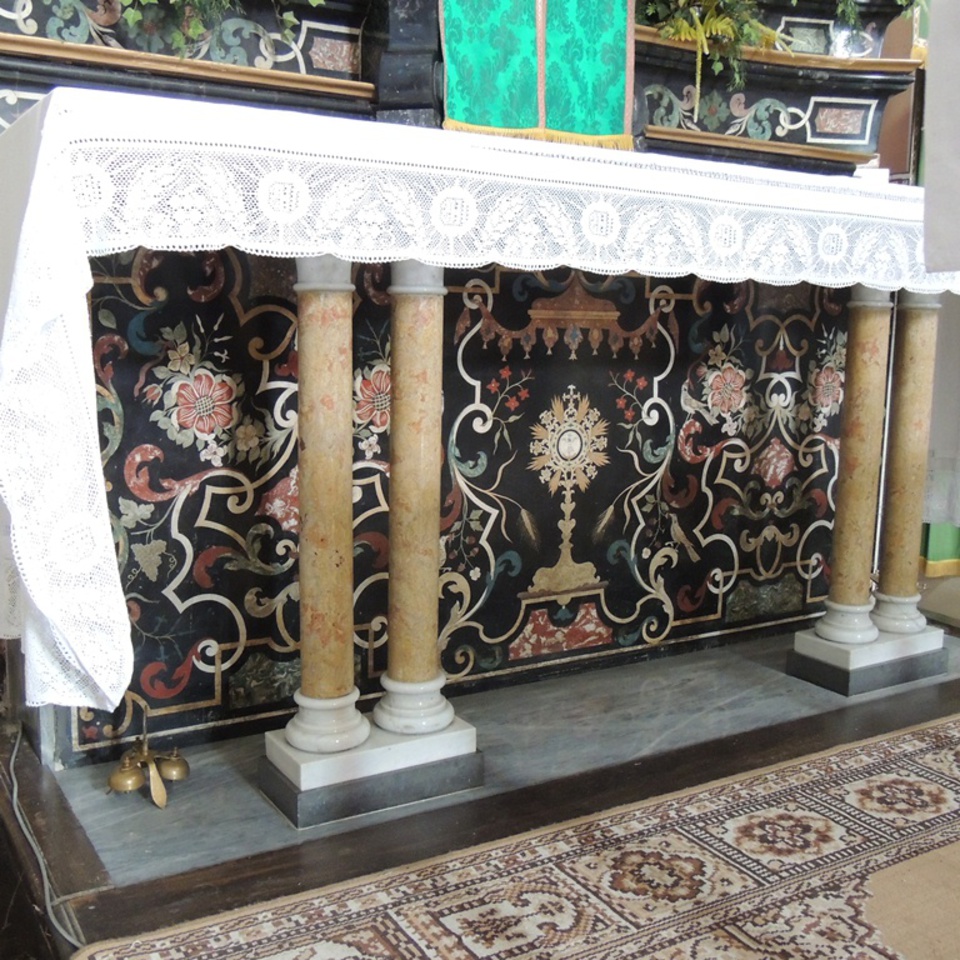 La facciata a salienti è ripartita da doppia coppia di paraste chiuse al primo ordine da trabeazione, al secondo il coronamento è dato da timpano triangolare. L'entrata è preceduta da una scalinata, sulla soglia d'ingresso è segnata a mosaico la data «1861», mentre sullo scalino del presbiterio è riportata la data «1859» anno in cui fu rifatto a mosaico il pavimento del presbiterio. L'altare maggiore, realizzato interamente in scagliola intarsiata come il paliotto che lo decora, è opera riferibile a Francesco Solari. Nel 1859 fu rimaneggiato l'altare maggiore con l'aggiunta della mensa su colonnine e, verosimilmente, anche del tabernacolo.