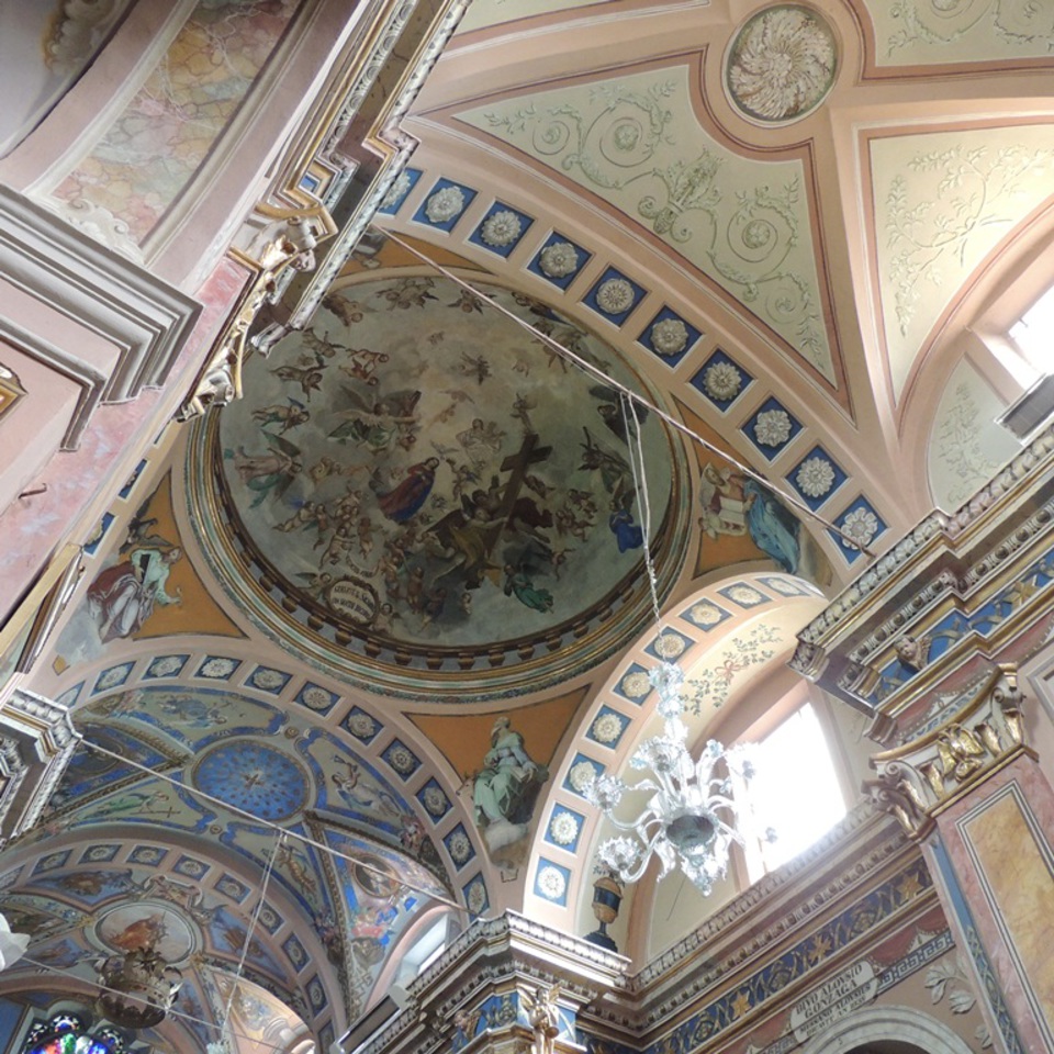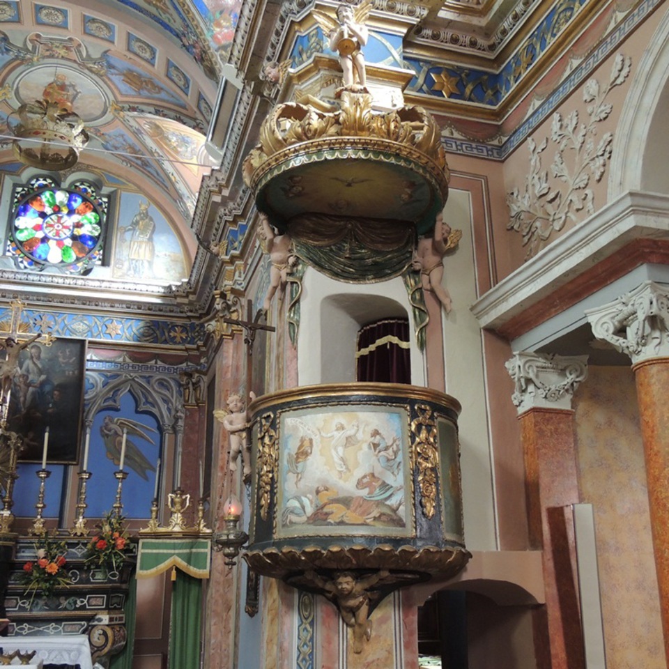 L’interno ha mantenuto le antiche pitture della volta; il cornicione riporta l’aquila a due teste, stemma dei Montalero.