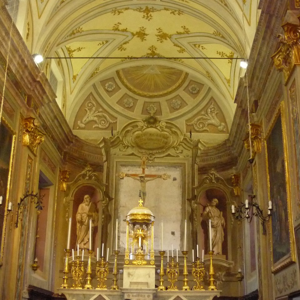 Nel Presbiterio l’altare, dalla linea sobria, rivestito di marmi policromi, sormontato da un tempietto in legno dorato e da un crocifisso quattrocentesco.