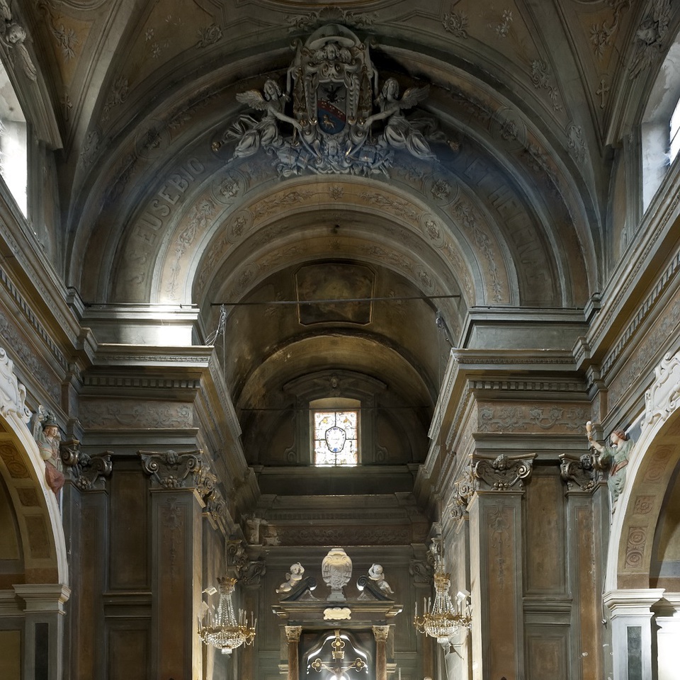 La chiesa fu realizzata per volere di Mons. Giacomo Goria, Vescovo di Vercelli e fondatore stesso dell'Opera di Sant'Elena e degli Oblati di Sant'Eusebio, edificata nelle attuali linee barocche su progetto di Amedeo di Castellamonte, inglobando una precedente cappella già documentata nel 1556. I lavori furono diretti dal capomastro luganese Francesco Garvi e durano dal 1646 al 1652, anno in cui venne benedetta. Nel decennio successivo venne completato l'interno e fra il 1662 ed il 1664 lo stuccatore luganese Giovanni Luca Corbellini eseguì lo stemma vescovile con angeli e gli stucchi delle virtù teologali. La pianta della chiesa si presenta a navata unica terminante con abside rettangolare, sagrestia, campanile e con quattro cappelle laterali voltate a botte con arcate decorate da cornici in stucco e figure allegoriche; le cappelle sono dedicate a San Carlo Borromeo, all’Immacolata Concezione, a San Francesco d’Assisi ed alla Crocefissione; la navata centrale è scandita da lesene binate con capitelli corinzi in stucco ed è coperta da volta a botte lunettata con arconi centrali.