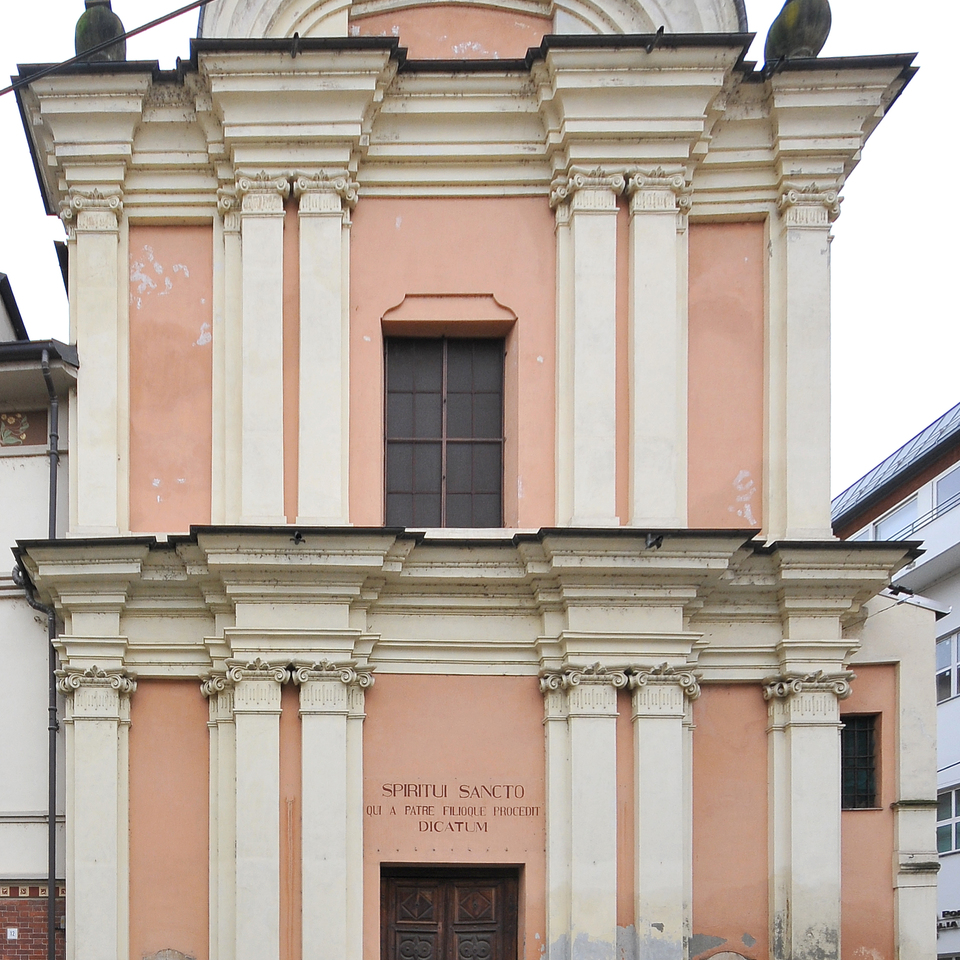 Infine meritano un accenno anche gli ambienti della sacrestia, sempre di manifattura settecentesca, affrescati dal Guala con angeli che adorano lo Spirito Santo e che rappresentano uno dei più graziosi e riusciti affreschi della sua maturità (1744) per prospettiva colore e perfezione dei movimenti. La porta che conduceva dalla sacrestia doveva essere squisitamente barocca purtroppo venduta nel secondo quarto del XX secolo al Comune insieme alle canne dell’organo per risanare i debiti e far fronte alle spese della Confraternita.