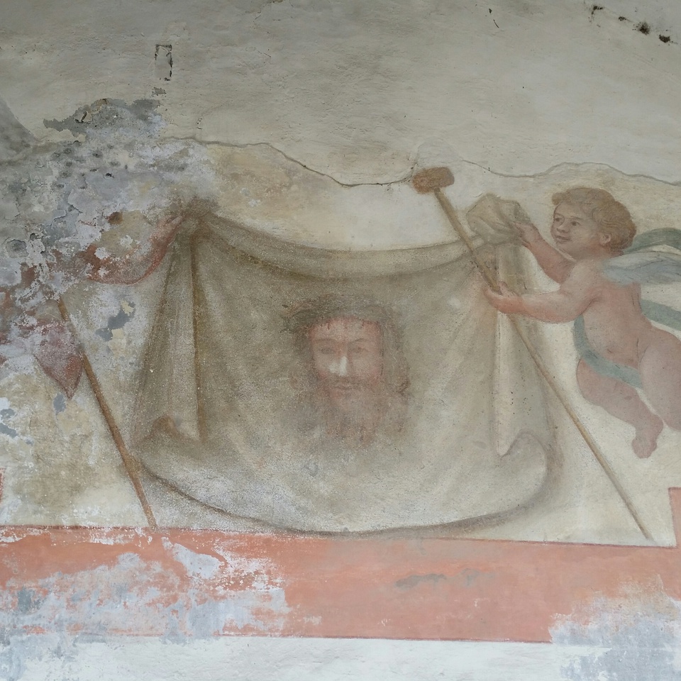 Sopra la porta d’ingresso della cappella è affrescata l’immagine di due angeli reggenti il Sudario con l’impronta del volto di Cristo.