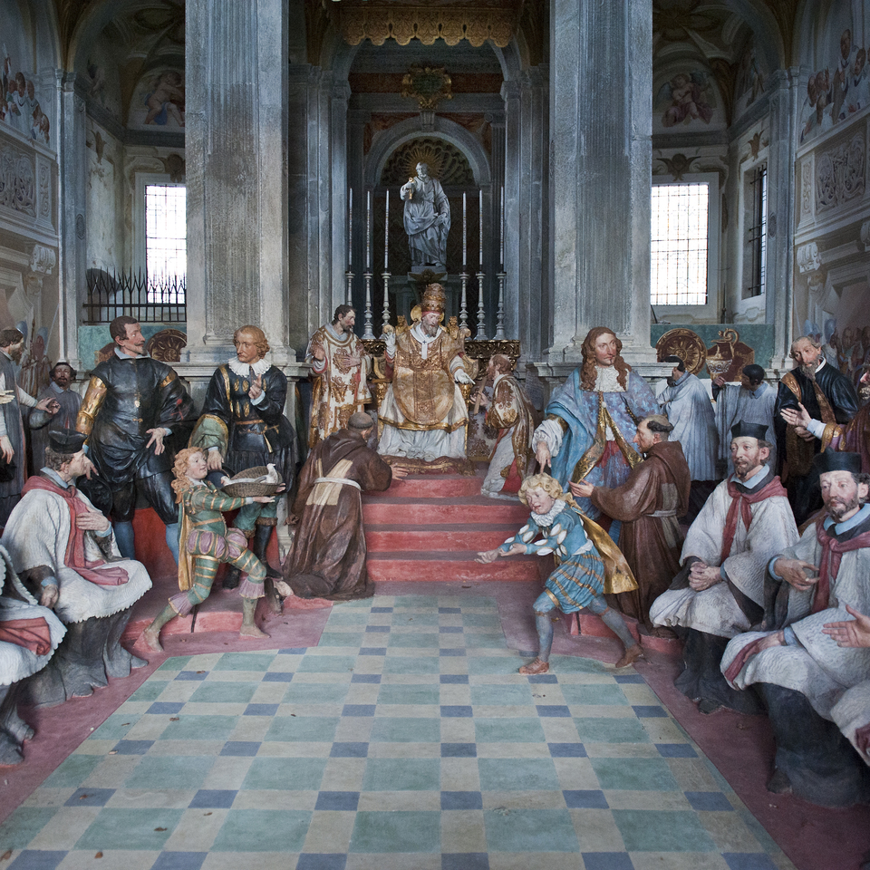 Il Sacro Monte di Orta vede la particolare dedicazione a San Francesco, con un ciclo di cappelle che presentano l’Acta vitae S. Francisci vario opere variisque figuris. Nonostante le diverse fasi di costruzione del complesso è verosimile pensare che sia sempre stata costante la presenza di una cultura francescana di riferimento che ha anche contribuito a garantire uniformità iconografica al percorso: modello principale erano infatti la Legenda Maior di Bonaventura, agiografia ufficiale del santo voluta dall’ordine, la Vita di Tomaso da Celano e alcuni testi di primitivismo francescano particolarmente cari all’ordine. Elementi questi di cui anche il vescovo Carlo Bascapè era certamente ben informato. Per comprendere le scelte di padre Cleto bisogna ricorrere al progetto originale del monte, di cui rimane testimonianza già in stampe del 1624-1628: esso comprendeva dalle trentatre alle trentasei cappelle, di cui il primo numero riprende gli anni della vita di Cristo.
