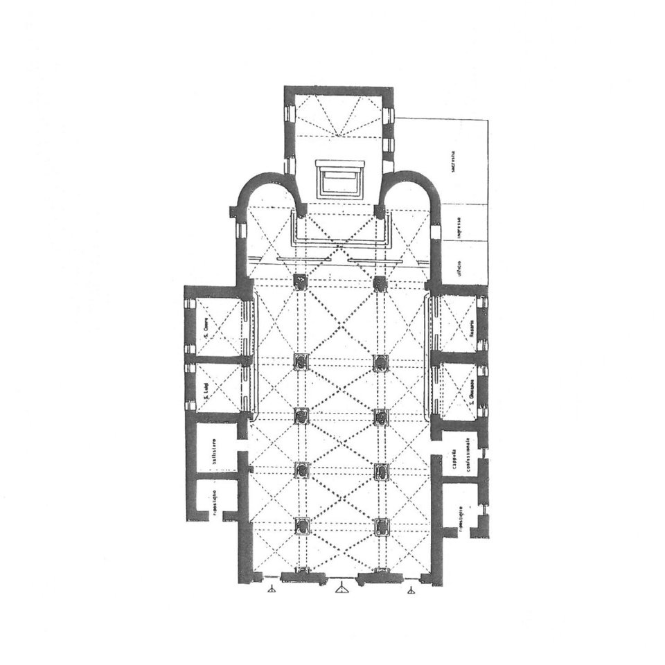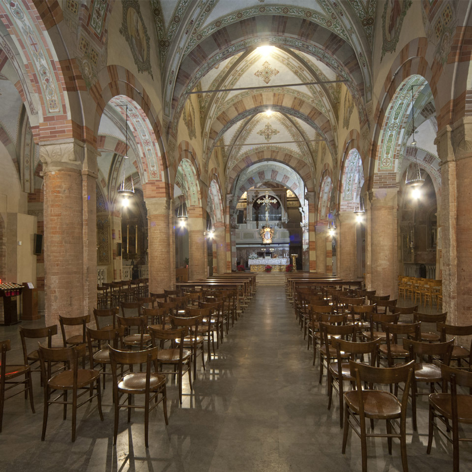 L’interno è a tre navate, le minori terminanti in absidi semicircolari, la maggiore in un coro a pianta rettangolare, che risale al 1564. Le navate sono formate da quattro campate, più transetto non sporgente e presbiterio. La copertura, originariamente a capriate, fu sostituita nel XIV secolo da volte a crociera costolonate; queste poggiano su pilastri di sezione rettangolare, con due semicolonne addossate in senso longitudinale, retti da plinti in pietra. I capitelli in arenaria dei pilastri sono uno diverso dall’altro, decorati da elementi vegetali stilizzati: un gruppo più antico è stato datato al 1040 ca., l’altro al 1165 ca..