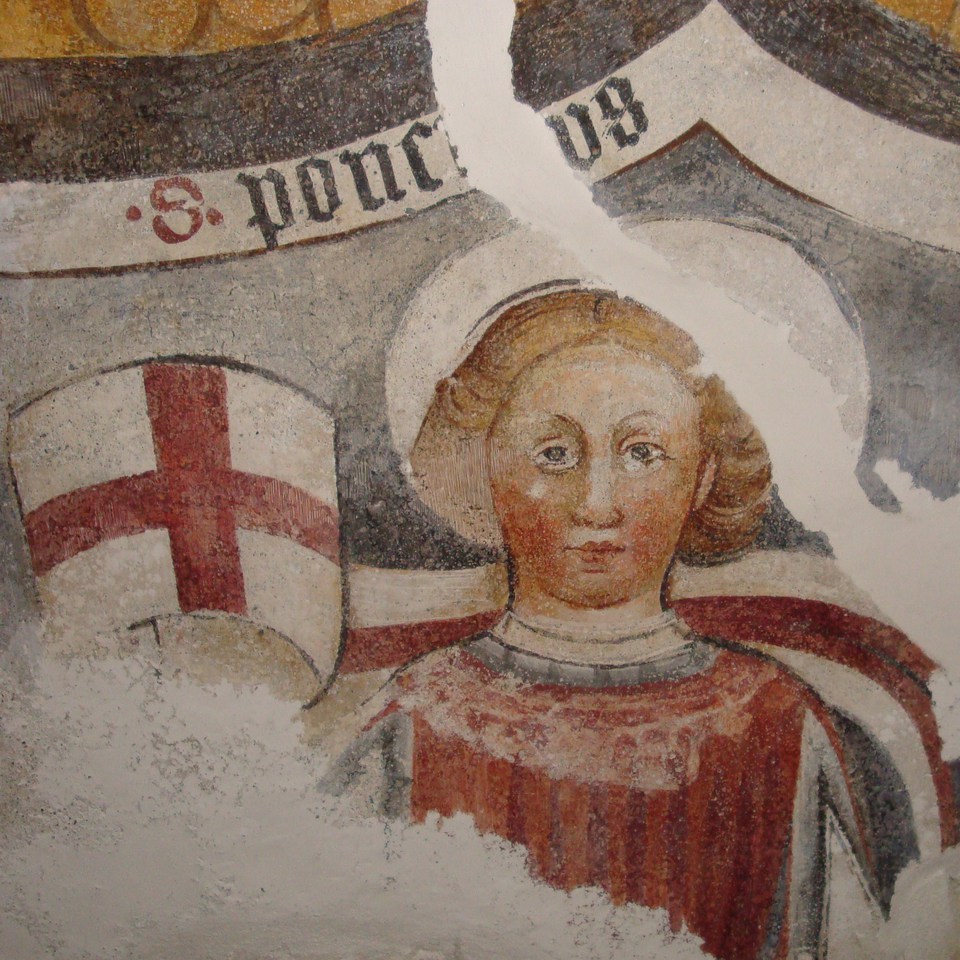 Al centro è raffigurato San Ponzio, in abito quattrocentesco con lo stendardo della Legione Tebea a cui apparteneva. La sua immagine in piedi occupa lo spazio della monofora centrale che era stata chiusa e intonacata.