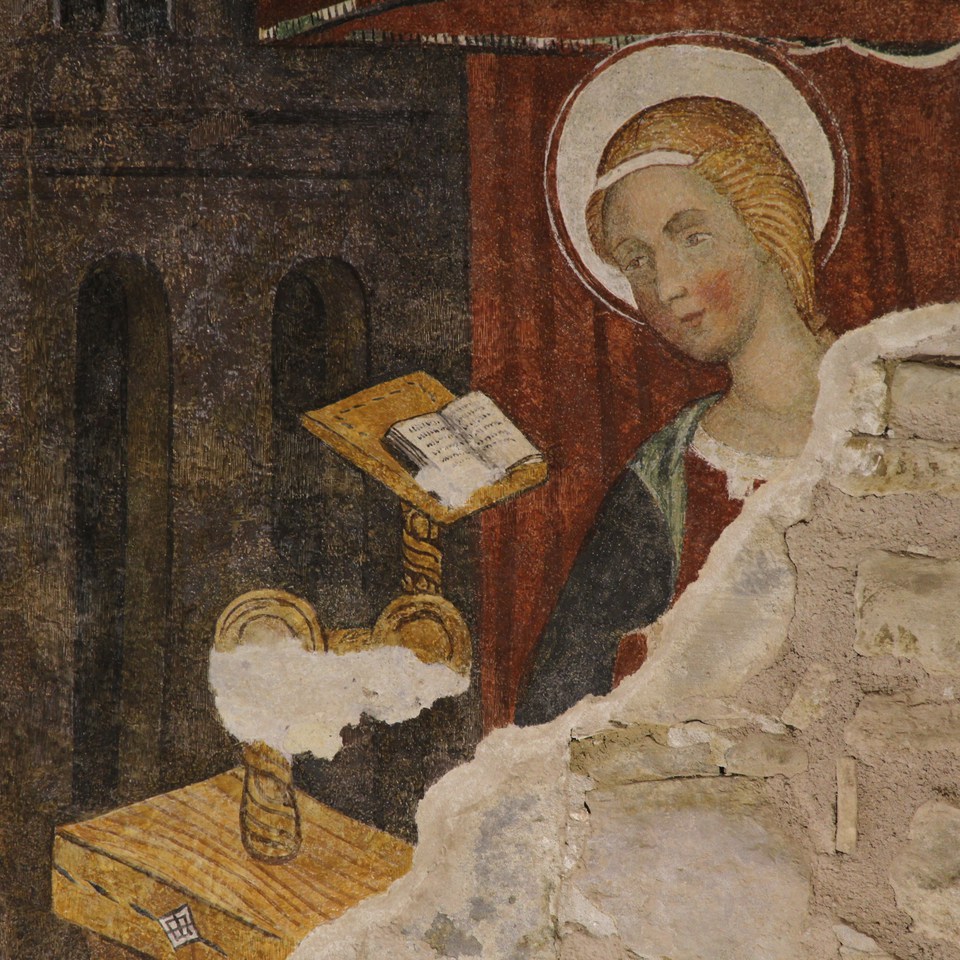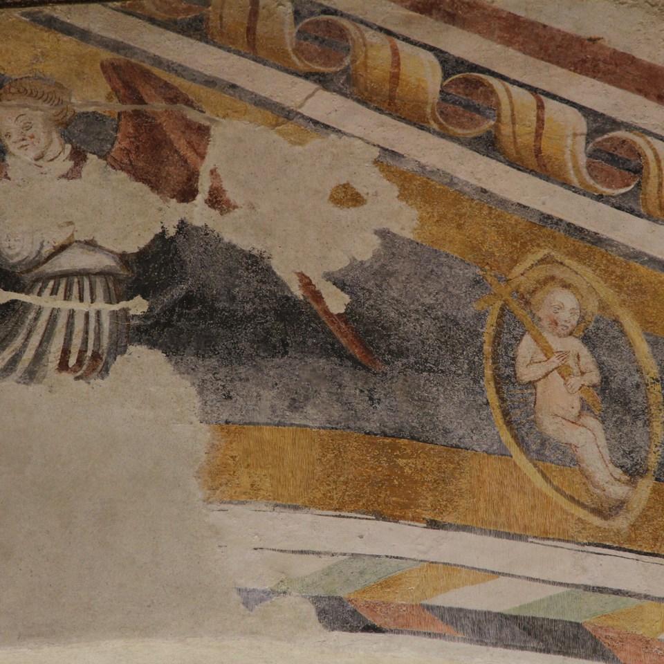 In basso a sinistra è raffigurato Sant’Antonio, protettore delle malattie di pelle. Ai suoi piedi si intravedono le zampe del porcellino e il fuoco acceso. A fianco i resti di un San Francesco.